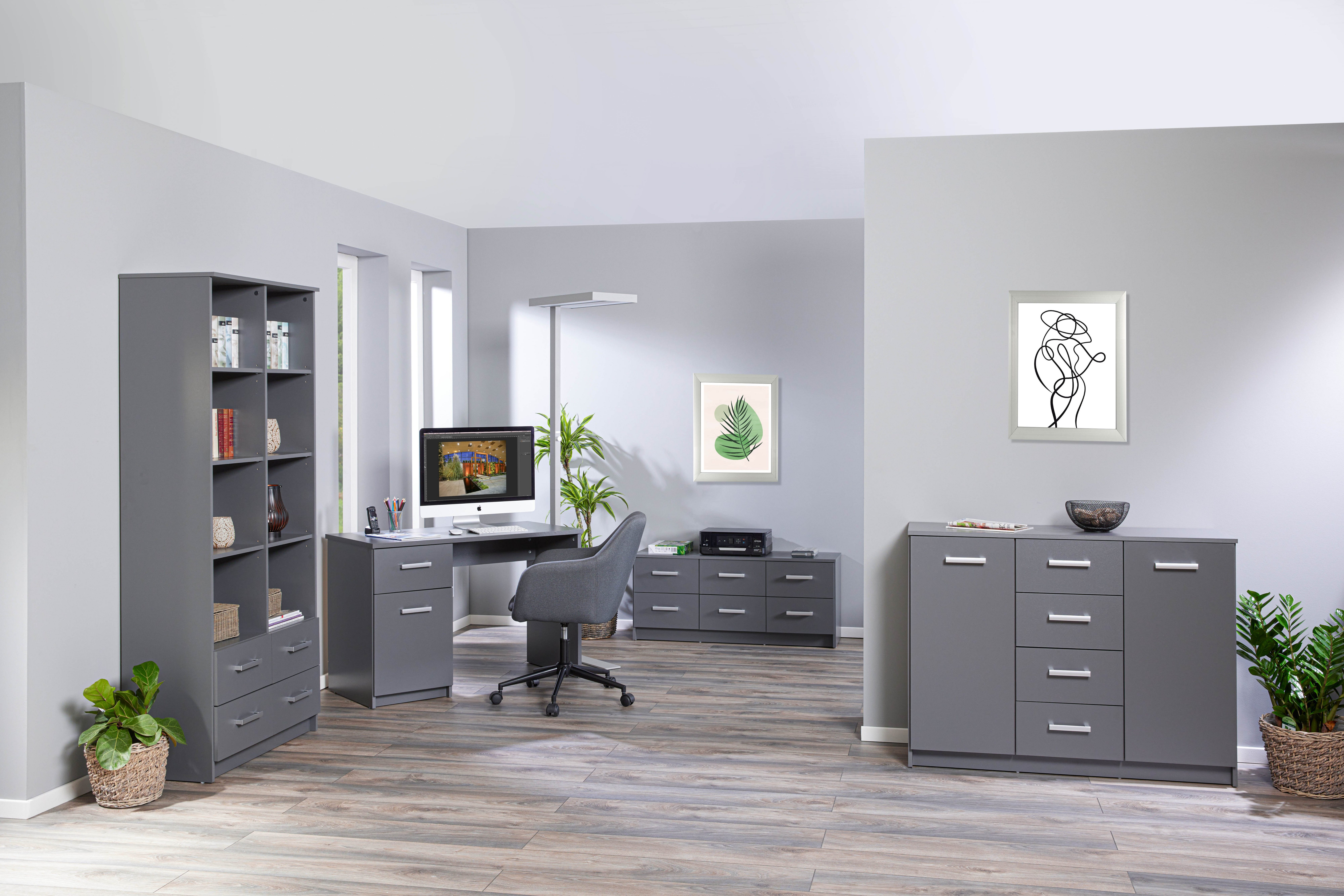 Die graphitgraue Farbe verleiht der Kommode ein zeitgemäßes Erscheinungsbild, das leicht in verschiedene Einrichtungsstile integriert werden kann. Die robuste Konstruktion gewährleistet Langlebigkeit und Stabilität.