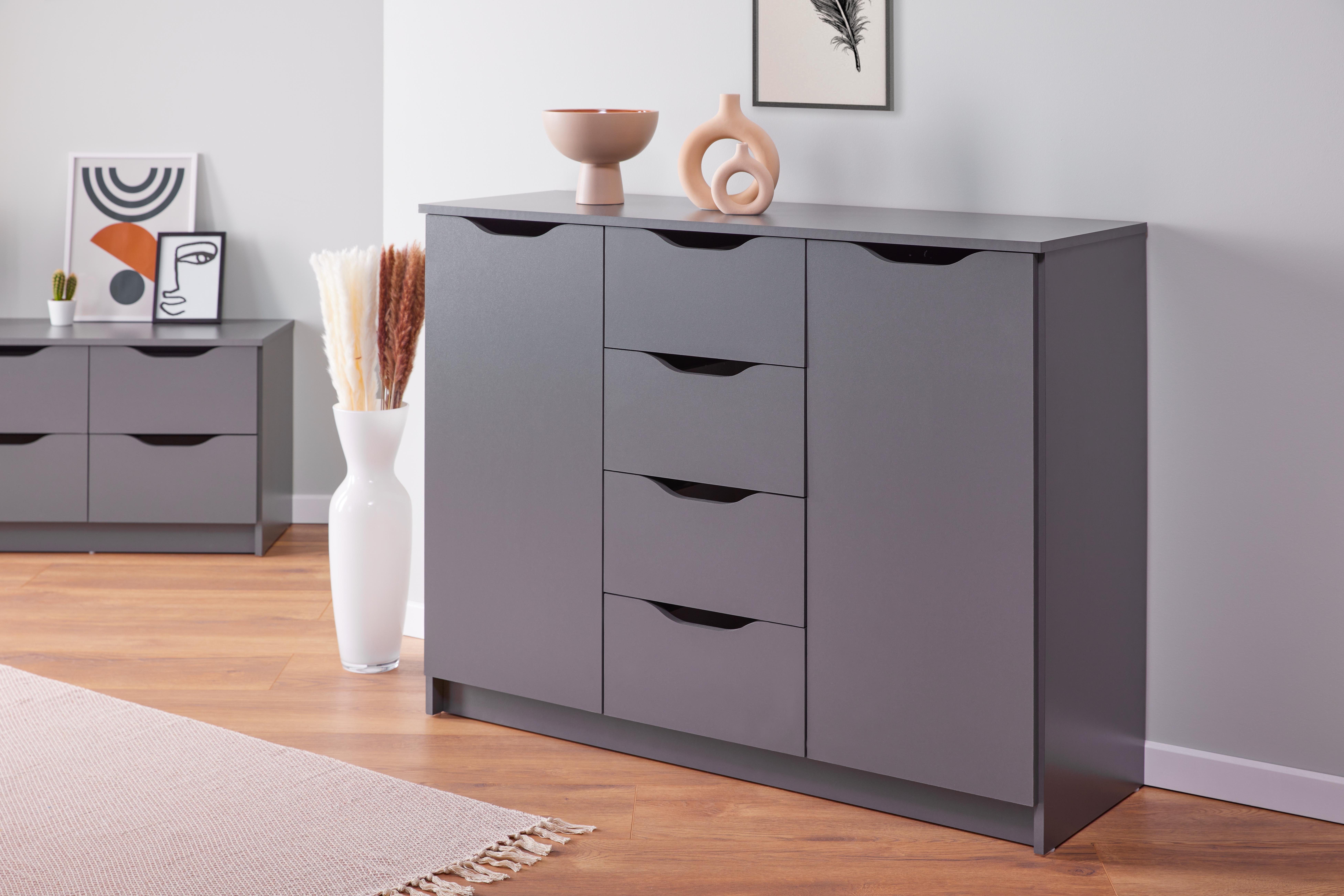 Lieferumfang | 1 x Kommode mit 4 Schubladen und 2 Türen, 1 x bebilderte Montageanleitung |