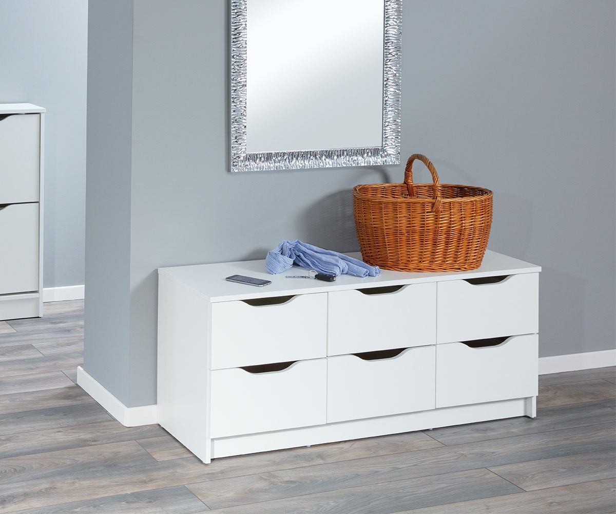 Die melaminbeschichtete Oberfläche schützt vor Kratzern und sorgt für eine zeitlose Erscheinung, auch nach vielen Jahren. Mit den Maßen 120 x 40 x 50 cm bietet diese Kommode ausreichend Stauraum und fügt sich perfekt in jeden Raum ein. Nutzen Sie sie im Schlafzimmer für Ihre Kleidung und Accessoires oder im Wohnzimmer als praktische Ablagefläche für Bücher, Zeitschriften und Dekoration. Die Kommode Westphalen 6-B ist eine Investition in stilvolle und praktische Organisation Ihres Stauraums – ein langlebiges und hochwertiges Möbelstück, das Ihnen viele Jahre Freude bereiten wird.