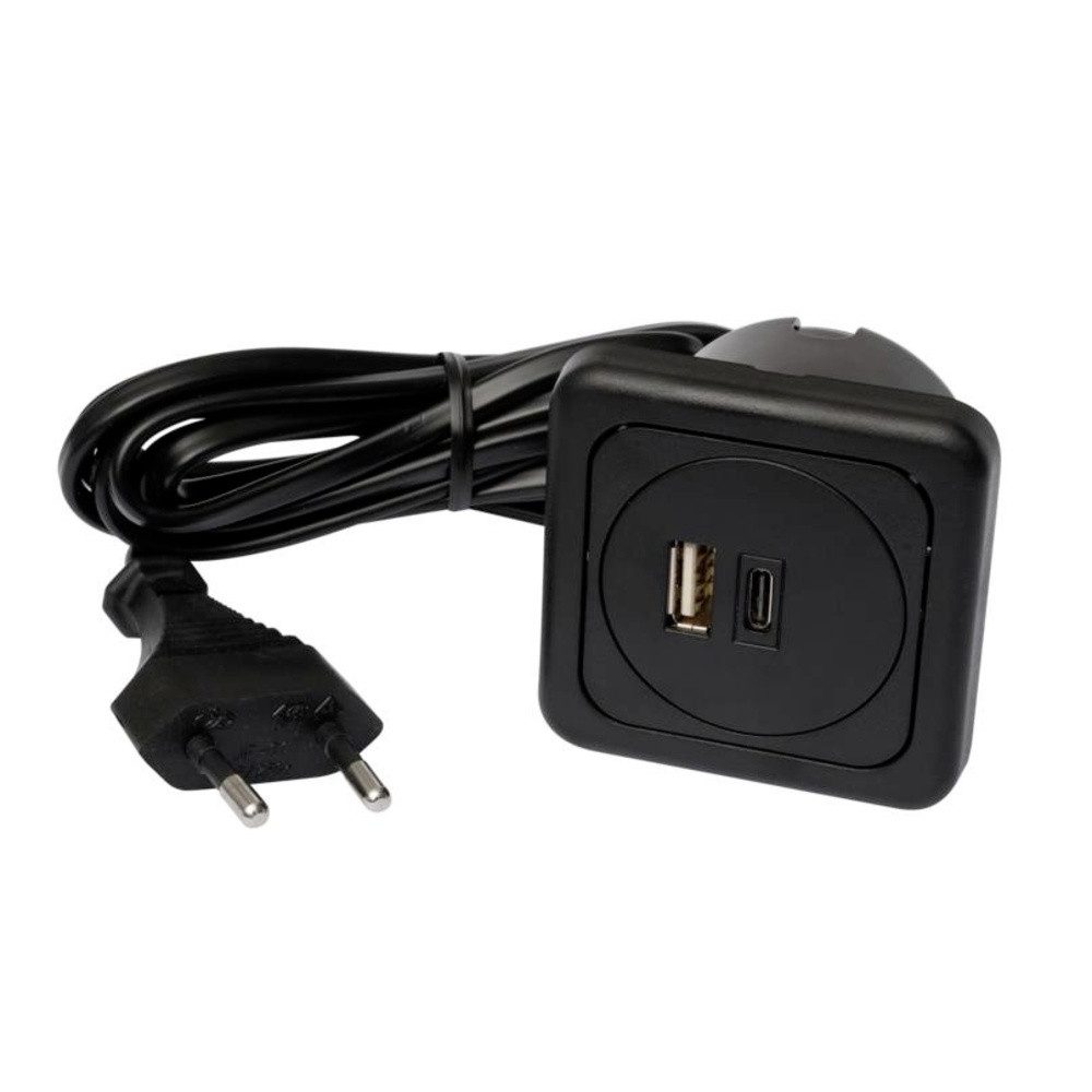 Doppel-USB-A/C Ladesteckdose zum Laden von Smartphones, Tablets, Powerbänken und mobilen Endgeräten. Die Einheit ist mit einer Berührungsschutzkappe nach hinten gesichert und einer 2 m Zuleitung steckerfertig konfektioniert. Ideal zum Einbau in Fronten von Möbeln, Nachttischen, Küchenzeilen, Werkbänken oder Schreibtischen