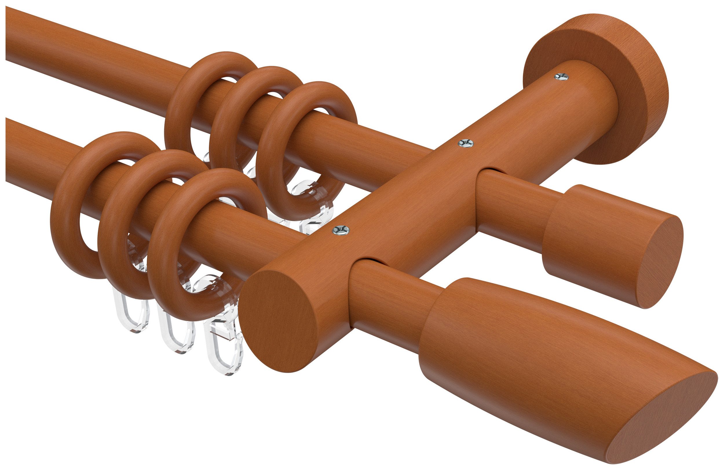 Lieferumfang | Endstücke "Ellipse / Schräge" Kirschbaum lackiert Endstücke "Kappe" Kirschbaum lackiert Holzstangen 100 cm Kirschbaum lackiert Rundringe Kirschbaum lackiert mit Faltenlegehaken Träger 2-läufig Kischbaum inkl. Befestigungsmaterial |