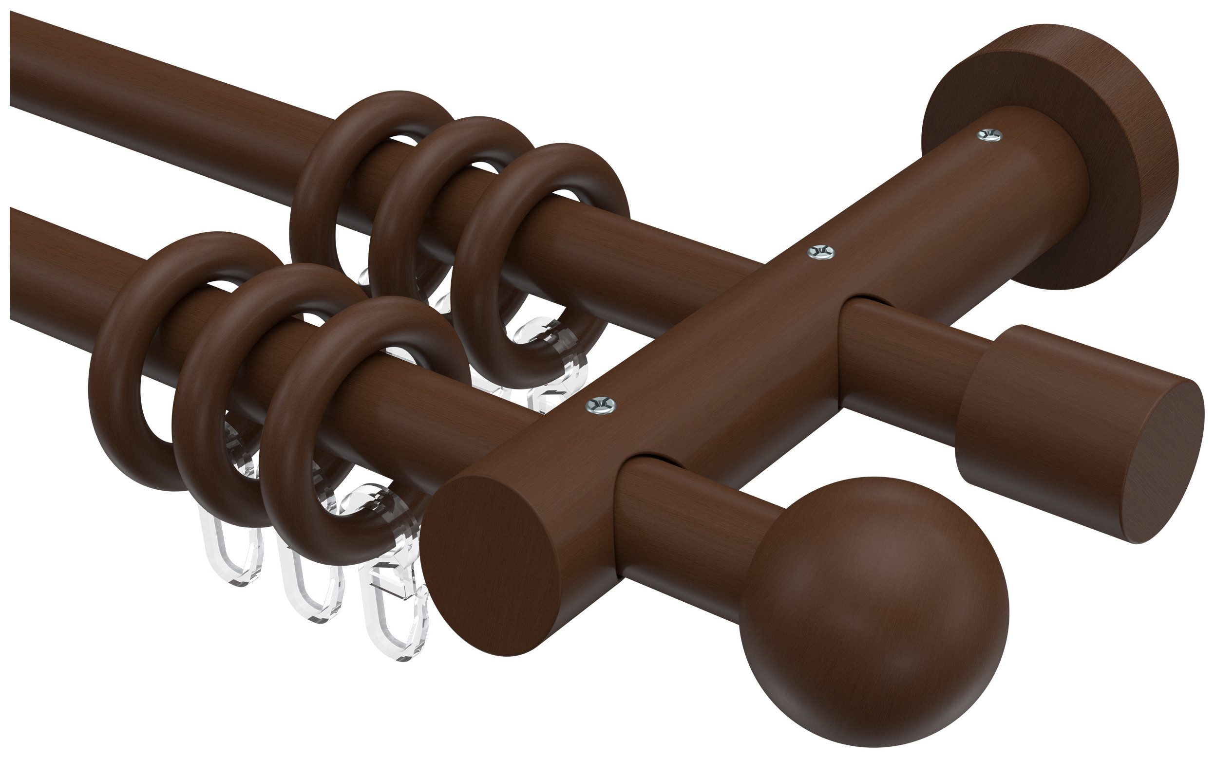 Lieferumfang | Endstücke "Kappe" Nussbaum lackiert Endstücke "Kugel" Nussbaum lackiert Holzstangen 100 cm Nussbaum lackiert Rundringe Nussbaum lackiert mit Faltenlegehaken Träger 2-läufig Nussbaum lackiert inkl. Befestigungsmaterial |