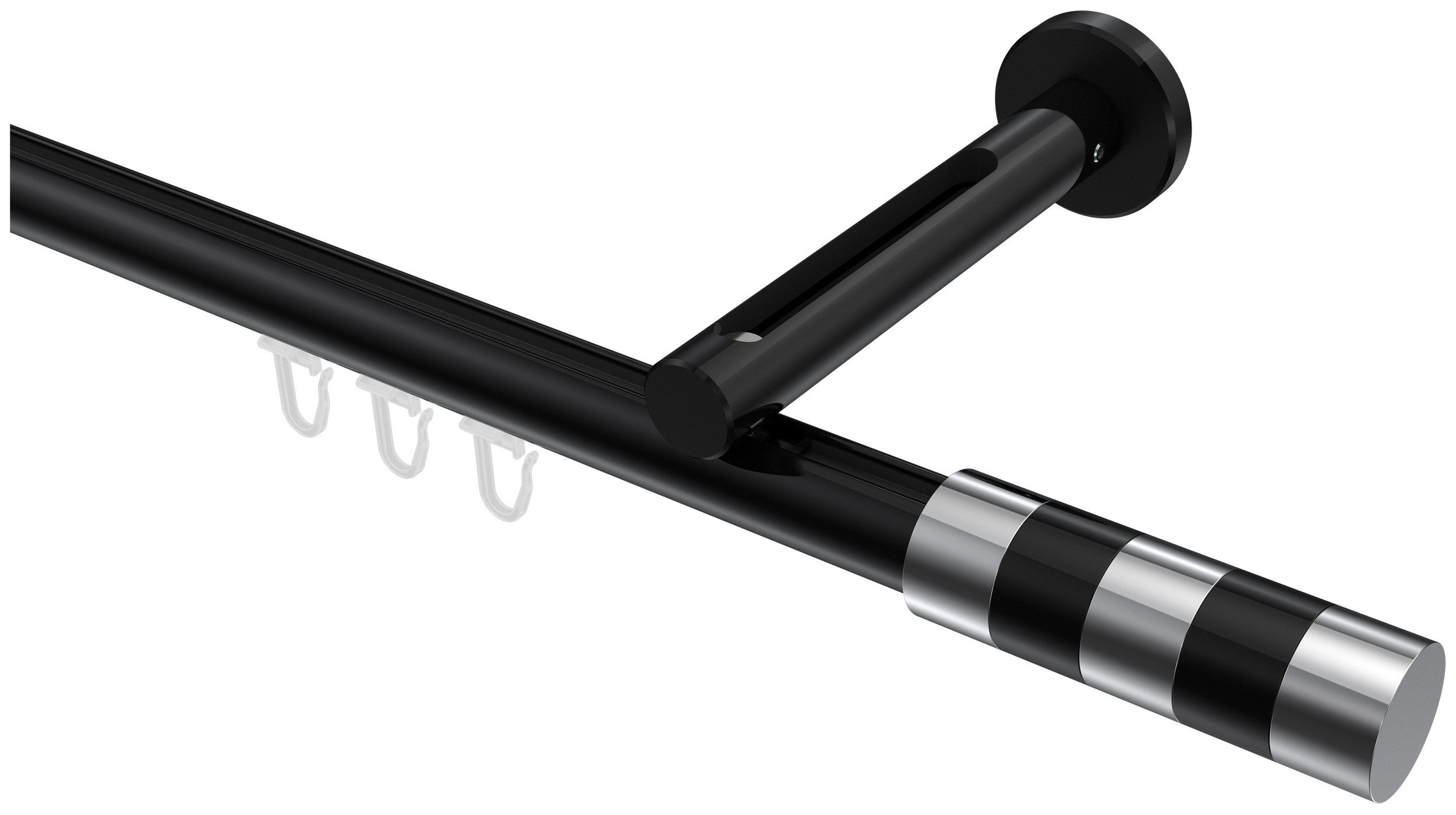 Lieferumfang | Endstücke "Zylinder / Bicolor" Chrom/Schwarz Faltengleiter mit Faltenlegehaken Innenlaufprofil 100 cm Schwarz Träger 1-3-läufig Langloch Schwarz inkl. Befestigungsmaterial |