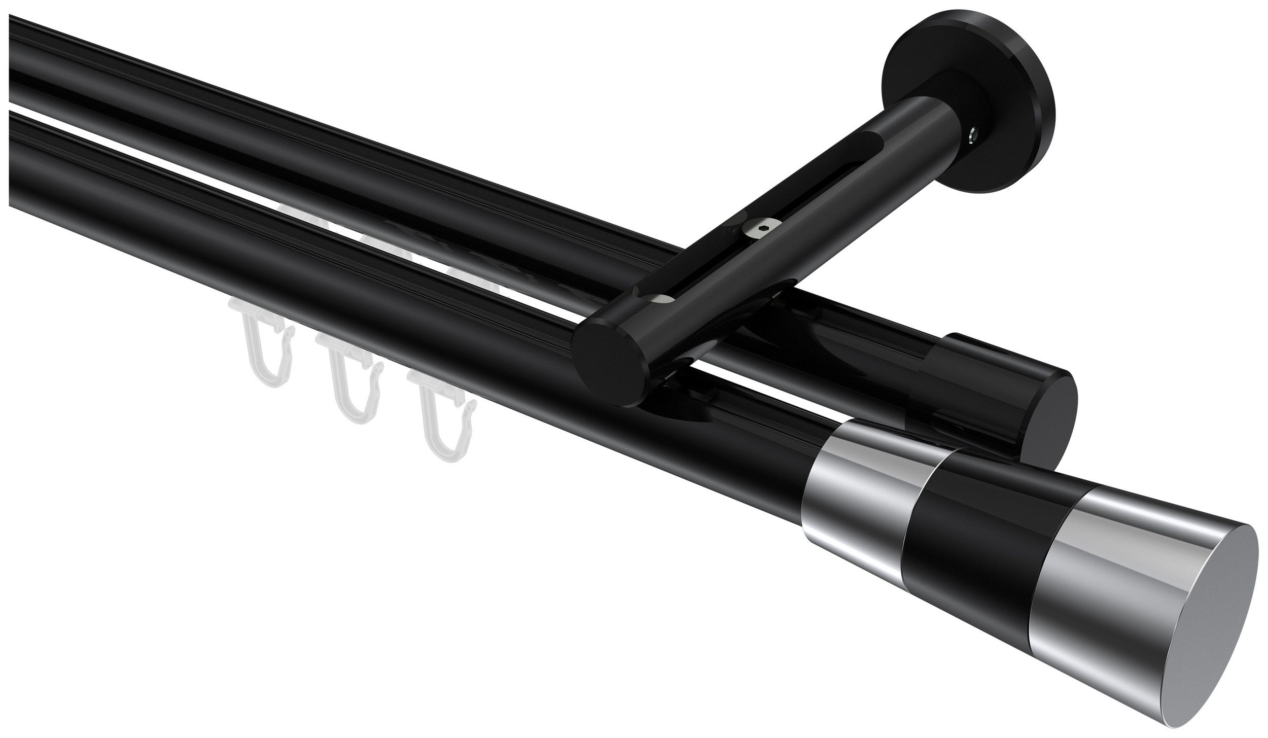Lieferumfang | Endstücke "Kappe" Schwarz Endstücke "Konus / Bicolor" Chrom/Schwarz Faltengleiter mit Faltenlegehaken Innenlaufprofil 100 cm Schwarz Träger 1-3-läufig Langloch Schwarz inkl. Befestigungsmaterial |