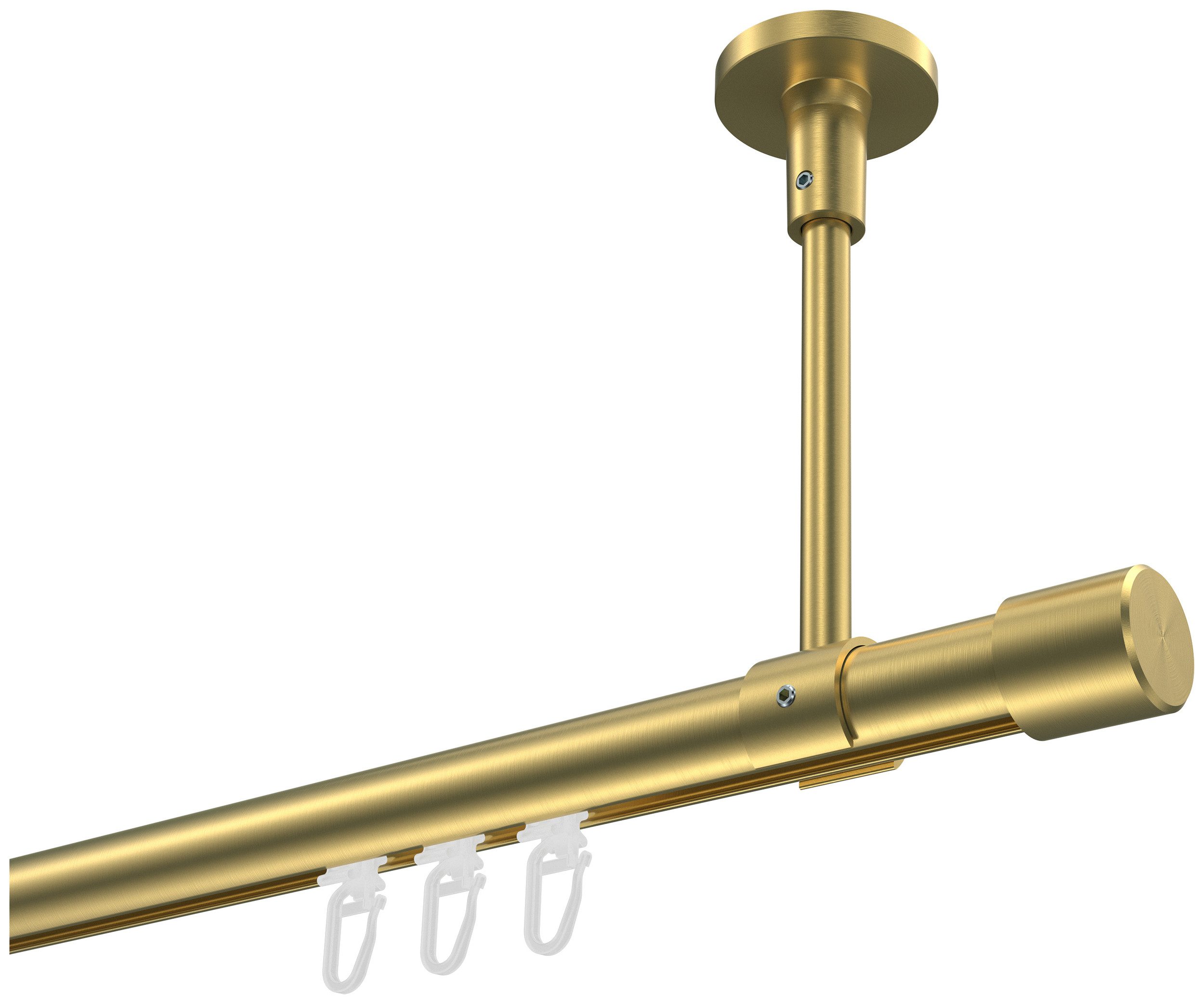Lieferumfang | Deckenträger 1-läufig Messing-Optik inkl. Befestigungsmaterial Endstücke "Kappe" Messing-Optik Faltengleiter mit Faltenlegehaken Innenlaufprofil 100 cm Messing-Optik |