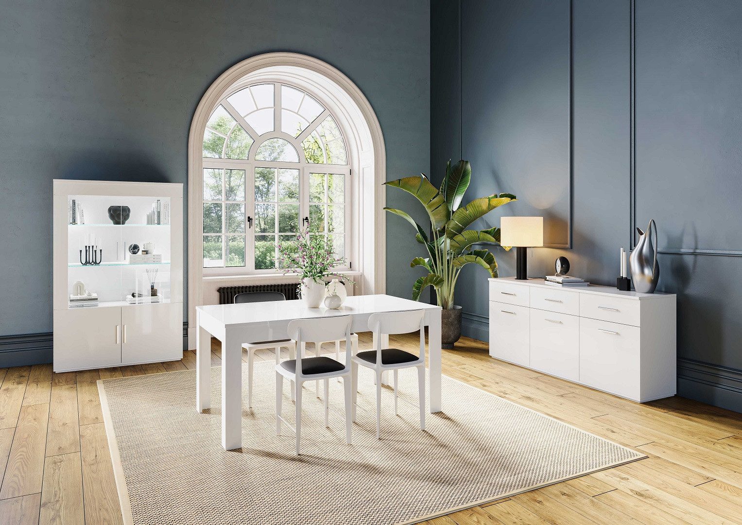 Set beinhaltet | 1x Vitrine 4-Türig, 1x Sideboard, 1x Esstisch |