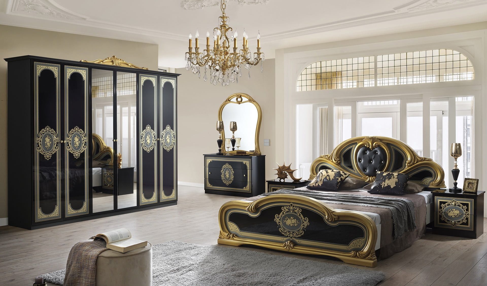Set beinhaltet | 1x Kleiderschrank, 1x Doppelbett, 1x Lattenrost, 2x Nachtkommode, 1x Wäschekommode, 1x Spiegel |