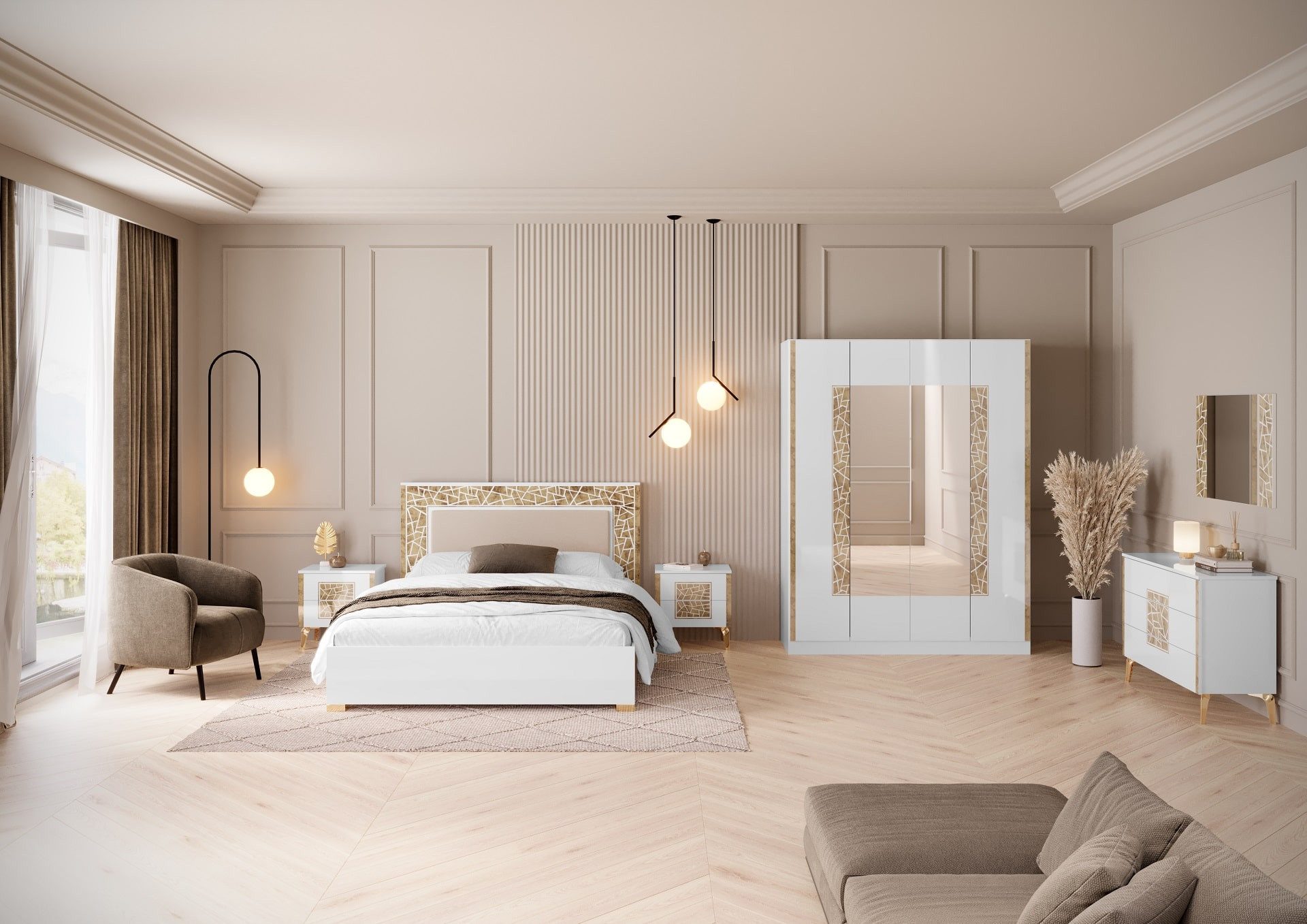 Set beinhaltet | 1x Kleiderschrank. 1x Bettgestell, 2x Nachtkommode, 1x Wäschekommode, 1x Wandpaneel mit Spiegel |