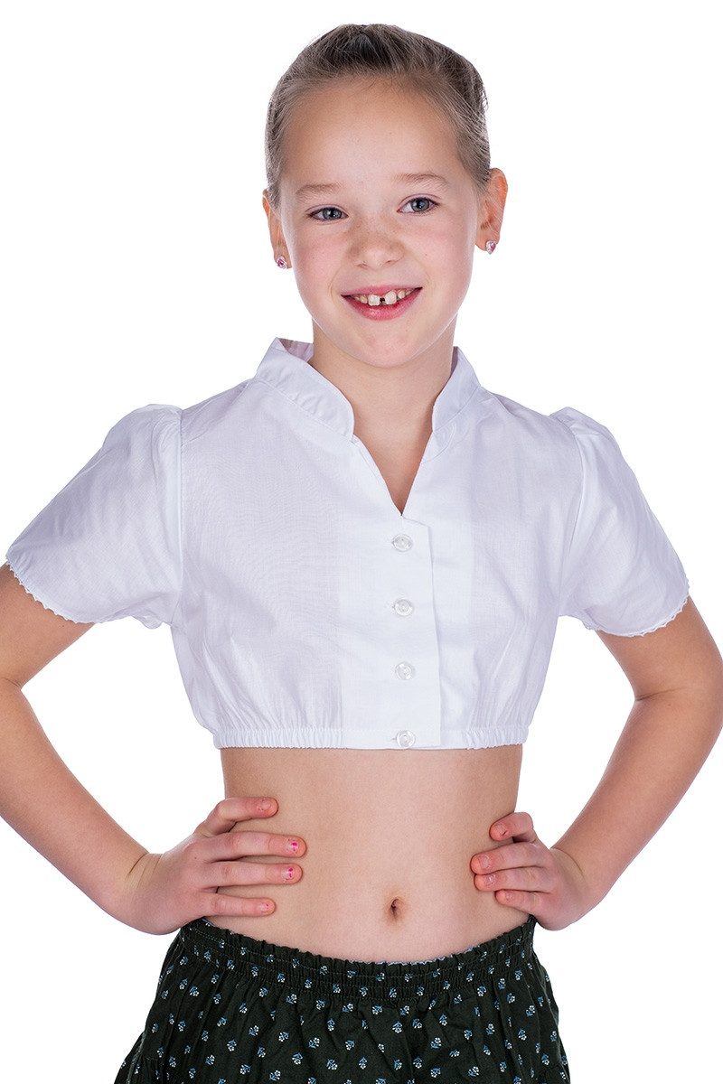 Mit dieser entzückenden kurzarm Dirndlbluse für junge Madl wird das Trachten-Outfit stilvoll wie bei Mama. Die liebreizende Trachtenbluse hat kurze Puffärmel, einen verstärkten Stehkragen, der in einen niedlichen V-Ausschnit übergeht, und eine Knopfleiste mit glänzenden Knöpfen. Liebliche, gezackte Häkelspitze schmückt die Bündchen der Ärmel. Der Baumwoll-Anteil garantiert eine angenehme Stoffqualität. Bis Размер 110 hat die Bluse für einen tollen Tragekomfort einen normalen, langen Blusen-Schnitt ohne Gummisaum und ab Размер 116 einen kurzen Schnitt bis unterhalb des Brustbereichs mit elastischem Saum. Das fantastische Design stammt von der Trachtenmarke Isar-Trachten. Bitte beachten Sie ab Размер 116 die Größenzuschläge.