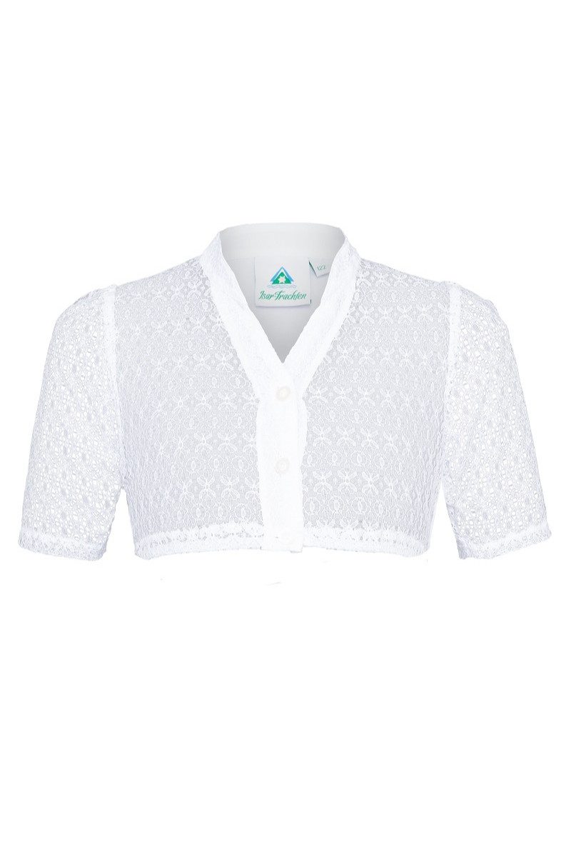 Liyana ist eine entzückende Dirndlbluse für Mädchen im fabelhaften Design von Isar-Trachten. Sie hat kurze Spitzenärmel, einen schönen Stehkragen aus Kontraststoff mit Spitzenbesatz und einen niedlichen V-Ausschnitt, der in die mit glänzenden Knöpfen bestückte Knopfleiste übergeht. Die Vorderseite sowie die Ärmel bestehen aus transparenter, nicht elastischer Ajour-Spitze im floralen Design und der bequeme Shirt-Rücken aus Baumwolle mit Stretch-Anteil. Der elastische Saum sorgt für einen guten Sitz. Diese Kreation lässt sich wundervoll kombinieren und stammt aus der exklusiven Kreation Fräulein Prachtvoll.