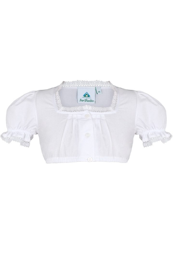 Die hübsche Mädchen Dirndlbluse "Mariela" wird mit schöner Baumwolle in angenehm leichter Stoffqualität gefertigt, hat einen niedlich verzierten Kasten-Ausschnitt und kecke Puffärmelchen. Sowohl den schicken Ausschnitt als auch die elastischen Bündchen der kurzen Ärmel zieren eine zarte, floral anmutende Häkelspitzenborte. Die Knopfleiste ist mit herrlich schimmernden Knöpfen mit welliger Oberfleiche besetzt. Beidseitig der Knopfleiste schmücken fesche, angedeutete Biesen die verzaubernde Dirndlbluse für Kinder. Der elastische Saum sorgt für einen guten Sitz. Bitte beachten Sie ab Размер 140 die Größenzuschläge.