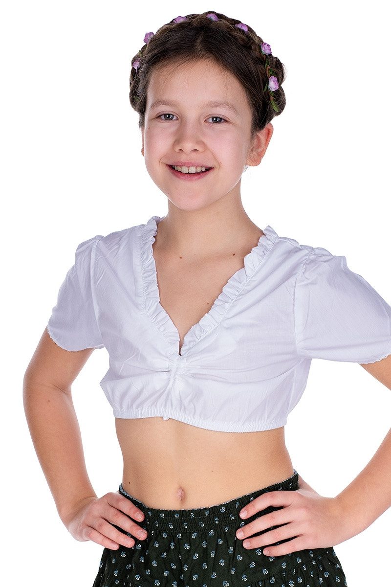 Die liebreizende Mädchen Dirndlbluse "Tessie" wird mit feiner Baumwolle in angenehm leichter Stoffqualität gefertigt, hat einen weiten, leicht herzförmigen Ausschnitt und kurze Ärmel. Den Ausschnitt zieren entzückend geraffte Rüschen und die Bündchen der leicht gepufften Ärmel eine zarte Spitzenborte im Zickzack-Look. Mittig vorn an der bezaubernden Dirndlbluse für Kinder gibt es einen Tunnelzug für die individuelle Regulierung des Ausschnitts und der elastische Saum sorgt für einen guten Sitz. Bitte beachten Sie ab Размер 140 die Größenzuschläge.