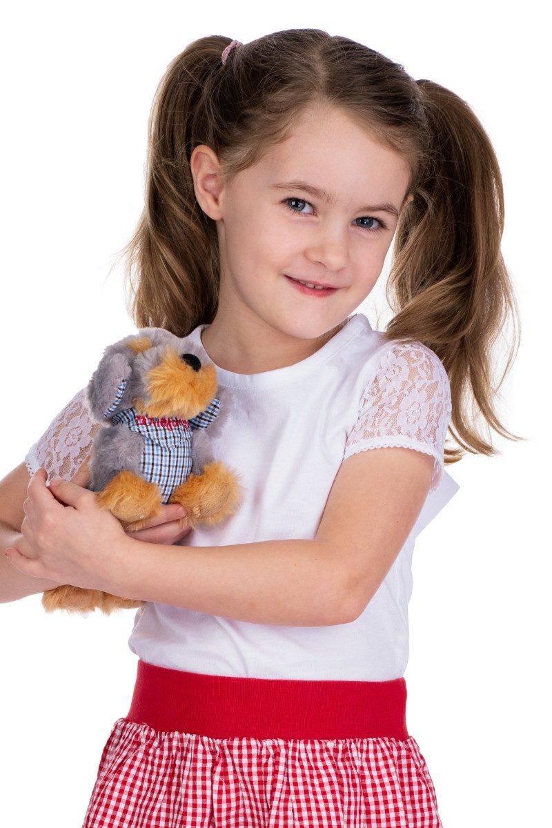 Dieses liebliche Trachtenshirt "Eyla" für kloane Madl wird aus feiner Baumwolle in angenehmer Jersey-Qualität gefertigt, hat einen umsäumten Rundhals-Ausschnitt und zauberhafte, kurze Spitzenärmel. Der Ausschnitt wird rückseitig mit einem Knopf sowie einer Knopfschlaufe geschlossen; darunter befindet sich ein kleiner, umsäumter Tropfen-Ausschnitt. Die kurzen Ärmelchen aus semitransparenter, floraler Tüllspitze mit der gezackten Spitzenborte an den minimal elastischen Bündchen geben dem hübschen Trachtenshirt für Babys und Kinder einen romantischen Touch. Das Trachtenshirt für Mädchen lässt sich super süß zu unseren Trachtenhosen und -Röcken kombinieren. Bitte beachten Sie ab Размер 104 die Größenzuschläge.