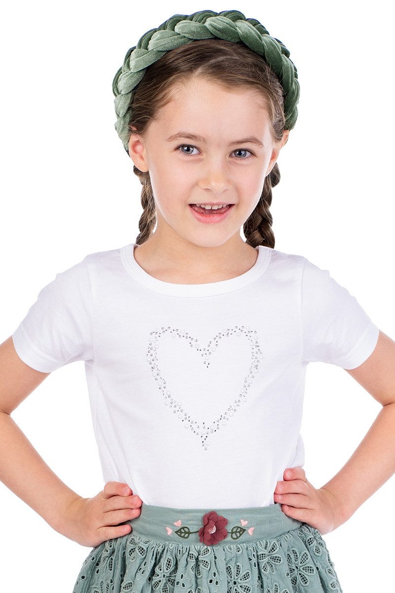 Das liebliche Kinder Trachtenshirt Herzerl, eine Kreation von der Marke Isar-Trachten für Mädchen, besteht aus reiner Baumwolle in angenehm weicher Jersey-Qualität, hat kurze Ärmel und einen umsäumten Rundhals-Ausschnitt. Bis Размер 92 verfügt das niedliche Mädchenshirt rückseitig über eine Druckknopfleiste. Auf der Vorderseite befindet sich ein schönes Herz-Motiv als Kontur, geformt aus runden Flachnieten in zwei Größen und funkelnden Strasssteinchen. Die größeren Nieten sind weiß, die kleineren sind silber. Das zauberhafte Trachtenshirt für Mädchen lässt sich entzückend zu unseren Kinder-Lederhosen, -Röcken und Trachtenjeans kombinieren, sorgt für Trachtenspaß bei den ganz Kleinen und eignet sich prima als Geschenkidee. Bitte beachten Sie den Größenzuschlag ab Размер 110.
