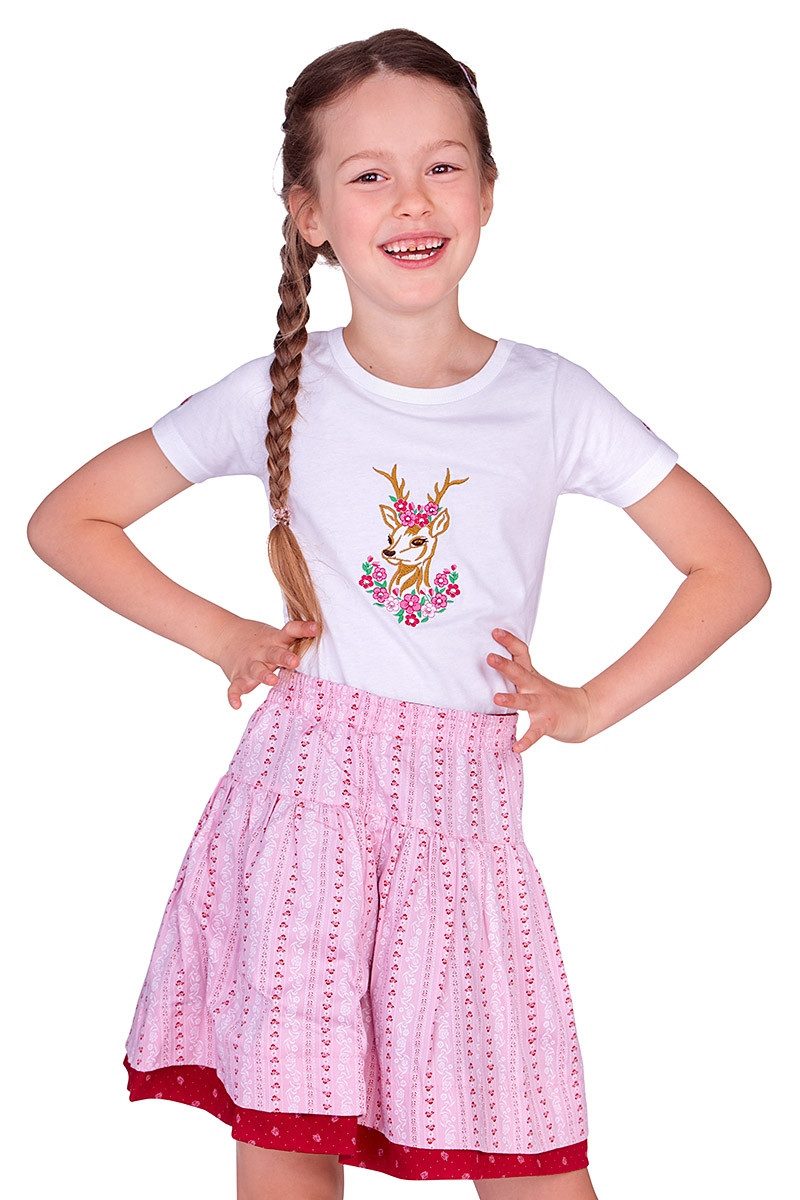 Dieser herzallerliebste Mädchenrock zum Wenden namens Tinka besteht aus feiner Baumwolle, ist ausgestellt geschnitten und hat einen breiten Bund mit einem elastischen Gummiband-Einsatz oben. Der Rockteil ist oben am Bund fesch gerafft und schafft so einen schicken Faltenwurf. Durch die Wende-Möglichkeit sind zweierlei Designs in einem Kleidungsstück vereint, somit kann nach Lust und Laune das Dekor gewählt werden. Die rosa-farbene Seite ist im Streifen-Look, geformt aus Blümchen und Ranken in Weiß sowie Rot, bedruckt. Unten sieht man den schönen Kontraststoff von der roten Seite, was einen leichten Lagen-Look ergibt. Die rote Seite des traumhaften Wenderocks zieren zarte Polka Dots in Grün und Rosenblüten in Rosa als Print. Über dem Saum ist eine entzückende, leicht glänzende Posamentenborte im Rosenranken-Stil in Rosa angebracht. Der Rock für Mädchen passt super süß zu unseren Kinder-Shirts und Kleinkind-Bodys. Bitte beachten Sie den Größenzuschlag ab Размер 128.