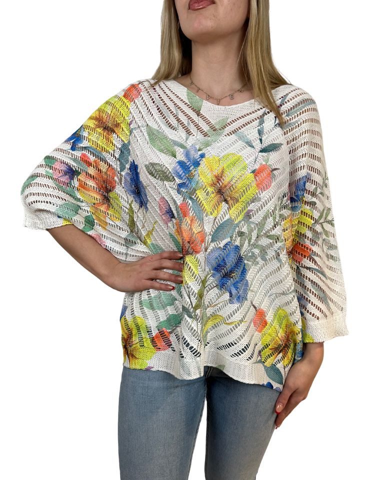 Das ITALY VIBES Langarmshirt BASILIA kombiniert ein romantisches Blumenmotiv auf der Vorder- und Rückseite mit einem modernen gehäkelten Design. Der U-Boot-Ausschnitt und die Fledermausärmel verleihen dem Shirt eine elegante, lockere Passform, die sich perfekt für den Lagenlook oder für besondere Anlässe eignet.