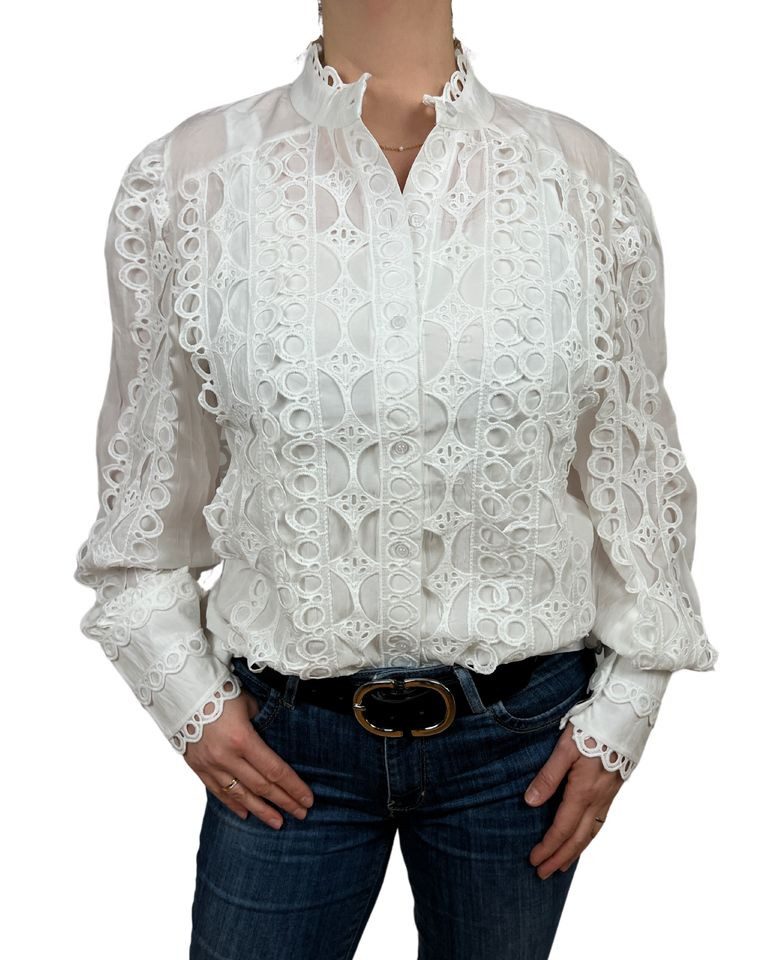 Die ITALY VIBES KATIA Langarmbluse mit Stehkragen und Spitzendetails ist der perfekte Mix aus modernem und femininem Stil. Ideal für Freizeit und Ausflüge.