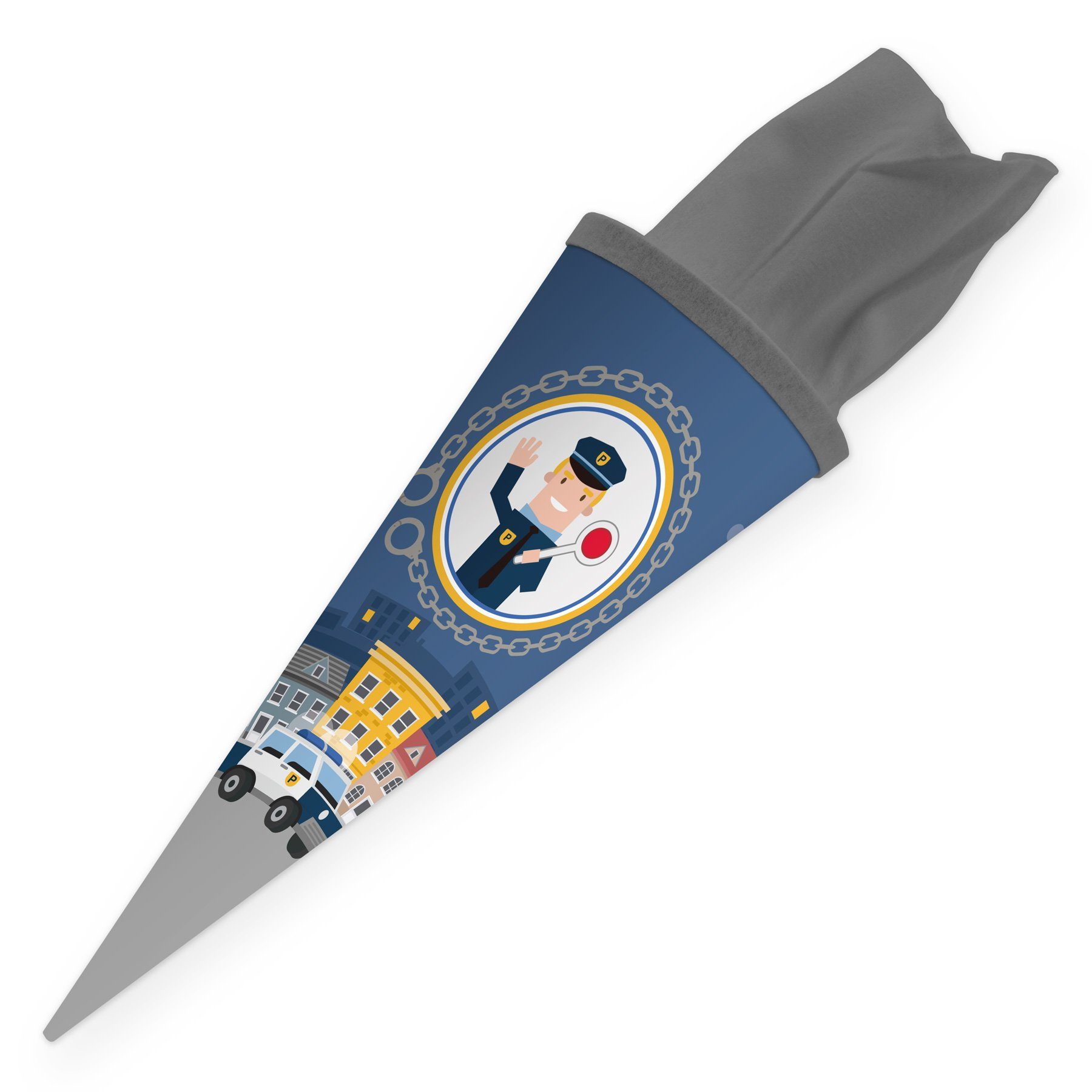 - Schultüte mit Filzverschluss - Größe: 35 cm - 250 gr. Karton - Motiv: Polizist, Polizeiauto mit Stadt bei Nacht im Hintergrund - Farbe Filzverschluss: grau - freundliches und fröhliches Design, auch ideal als Geschenkverpackung geeignet