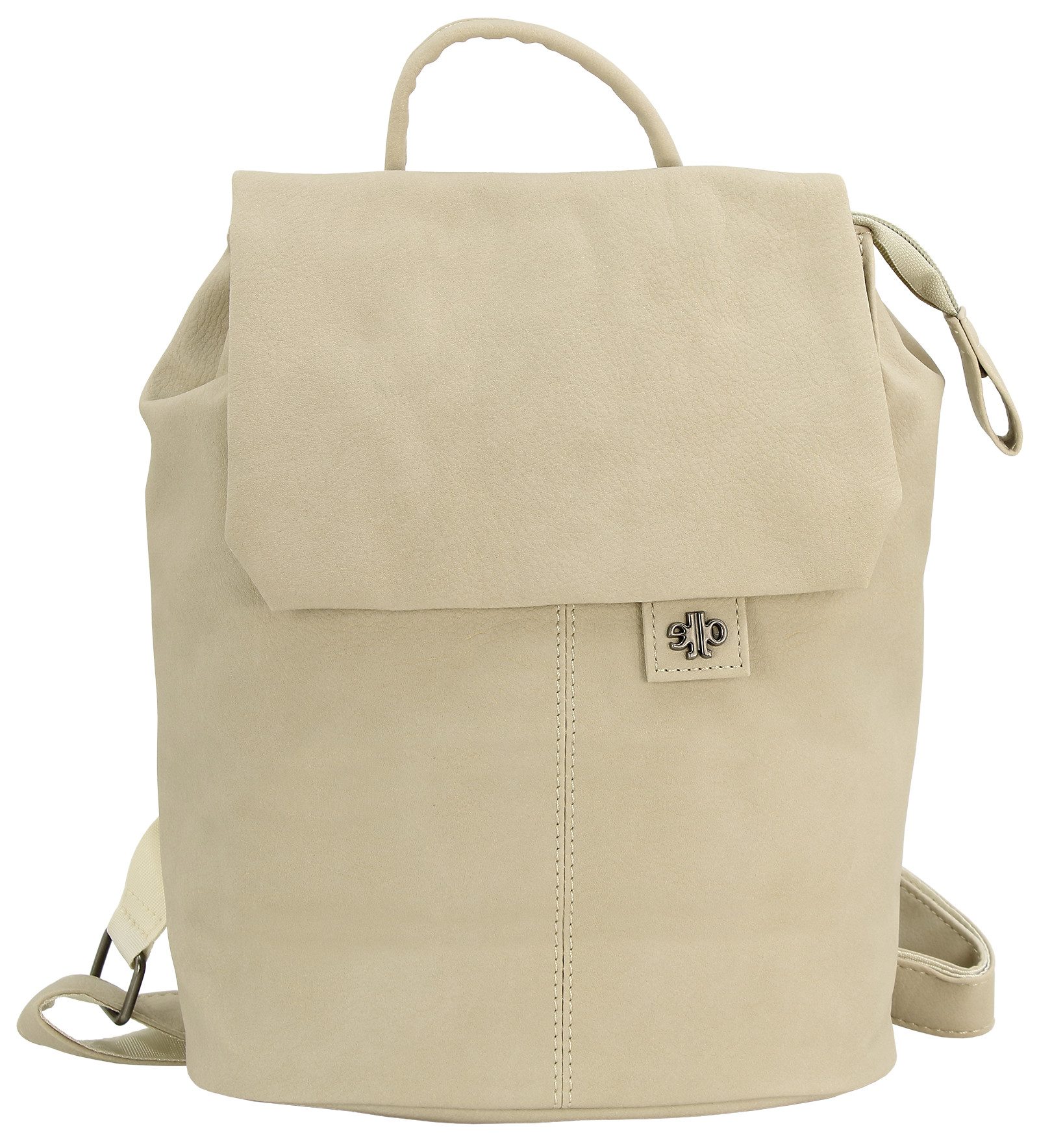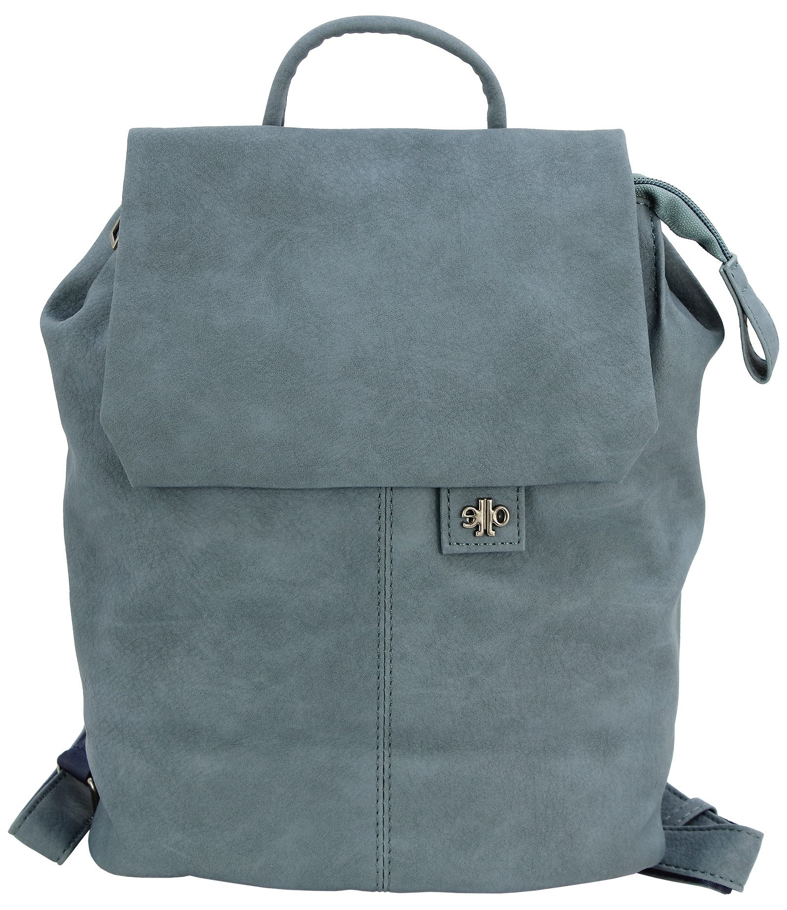 Unter dem Überschlag ist ein Reißverschlussfach und auf der Rückenseite befindet sich ein Anti-Diebstahl Fach mit Reißverschluss. Der Daypack hat einen Handgriff an der Oberseite.