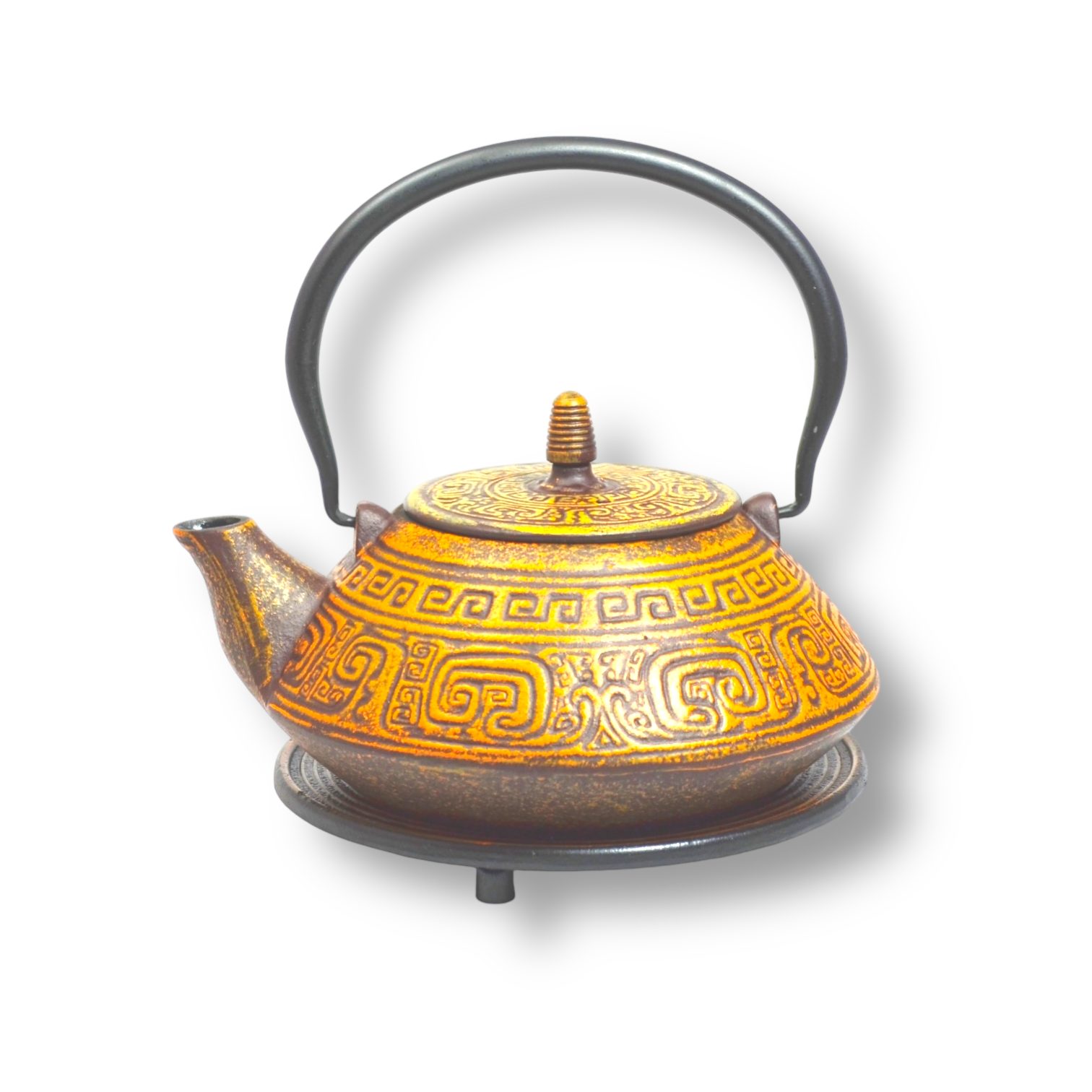 Gusseiserne Produkte der Marke ja-unendlich sind handgefertigte Kunstwerke, hergestellt in dem seltenen Sandgussverfahren nach japanischer Tradition. Mit bis zu 40 aufwendigen Arbeitsschritten ist jede Eisenkanne ein farbenfrohes Unikat, Farbe und Grösse können geringfügig abweichen. Qualität, Ästhetik und Raffinesse sind drei Schwestern, die unterschiedlicher nicht sein könnten und sich doch perfekt ergänzen. Gemeinsam gehen Sie auf Entdeckungsreise. „Das Muster auf der Korai-Teekanne erinnert mich an eine schöne Wandmalerei“, sagt Raffinesse. „Mir gefallen vor allem die gedeckten Farben die zu diesem Muster so gut passen“, fügt Ästhetik hinzu. „Und Korai ist wieder eine Teekanne, die Ästhetik, Raffinesse und Qualität in sich vereint“, fasst Qualität zusammen. Die Teekanne aus Gusseisen ist innen durchgehend emailliert und wird mit einem farblich passenden Untersatz aus Gusseisen, sowie einem Edelstahl-Sieb geliefert. Der Untersatz dient zum Schutz einer jeden Tischplatte. Gusseisen zeichnet sich durch seine Fähigkeit aus, Hitze und Kälte länger zu speichern – ein Vorteil warmen Tee länger zu genießen, aber auch um Getränke zu kühlen. Die beigelegte Gebrauchsanleitung verrät wie man sich lange mit der richtigen Anwendung und der materialbedingten Langlebigkeit an diesem einzigartigen und formschönen Kannen.