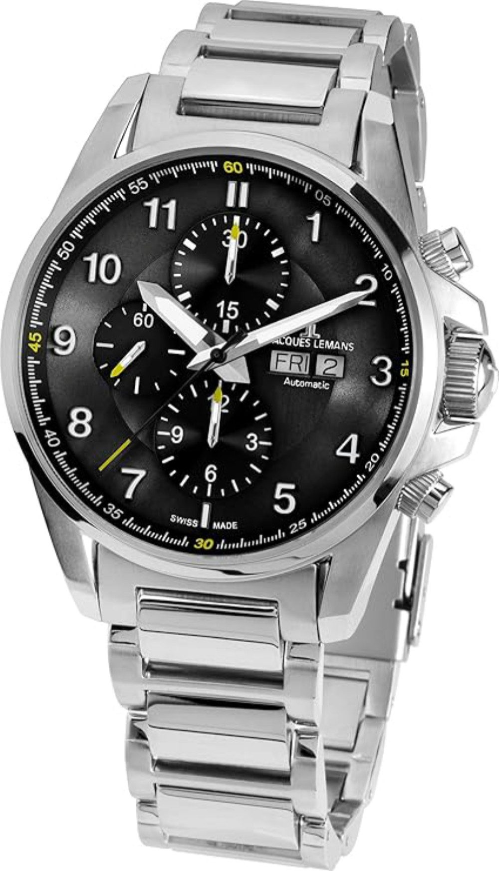 Die Jacques Lemans Armbanduhr Chrono Liverpool ETA Valjoux 7750 (Artikelnummer 1-1750D) ist ein herausragendes Zeitmessgerät, das höchsten Ansprüchen gerecht wird. Mit einem Gehäusedurchmesser von 44 Millimetern und einer Gehäusehöhe von 14,5 Millimetern präsentiert sich diese Uhr in einer großzügigen Größe, die Eleganz und Präsenz vereint.