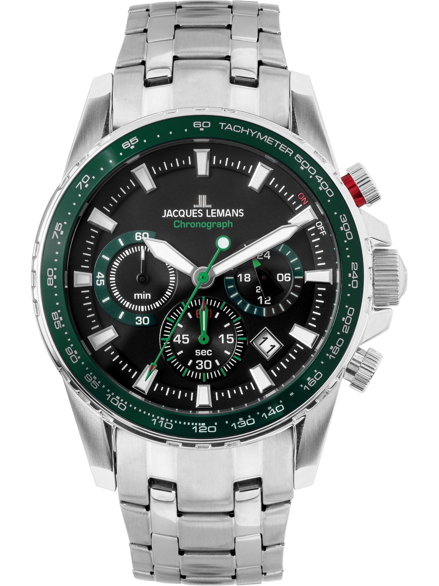 Jacques Lemans steht für Uhren, die in Design und Qualität deine Ansprüche erfüllen. Von eleganten Klassikern bis hin zu sportlichen Modellen – hier findest du Stil, der nie aus der Mode kommt. Für alle, die einen bleibenden Eindruck hinterlassen wollen. Der kühle Glanz mit dem runden Gehäuse ist immer eine stilsichere und edle Wahl. Über allem liegt ein schützendes Crystexglas. Typisch für einen Chronographen mit Hilfszifferblättern zeigt auch diese Jacques Lemans die Komplikationen Stoppfunktion, Tachymeter sowie Totalisatoren. Das schwarze Leder-Band verleiht der Uhr einen Hauch von Luxus und die Dornschließe sorgt dafür, dass sie perfekt sitzt. Durch die Leuchtzeiger und Leuchtindizes ist beste Ablesbarkeit auch im Dunklen oder bei schlechtem Licht jederzeit garantiert. Ein nützliches Feature ist die Datumsanzeige, die mit einem Blick das aktuelle Tagesdatum verrät. Nicht nur optisch ein Hingucker, sondern auch funktional überzeugend: Die Jacques Lemans-Uhr ist bis zu 10bar wasserdicht und dank des hochwertigen Quarz-Werks von Time Modul äußerst präzise. Diese Uhr von Jacques Lemans ist mehr als nur ein Accessoire – sie ist eine durchdachte Wahl für alle, die Wert auf Qualität und Stil legen.