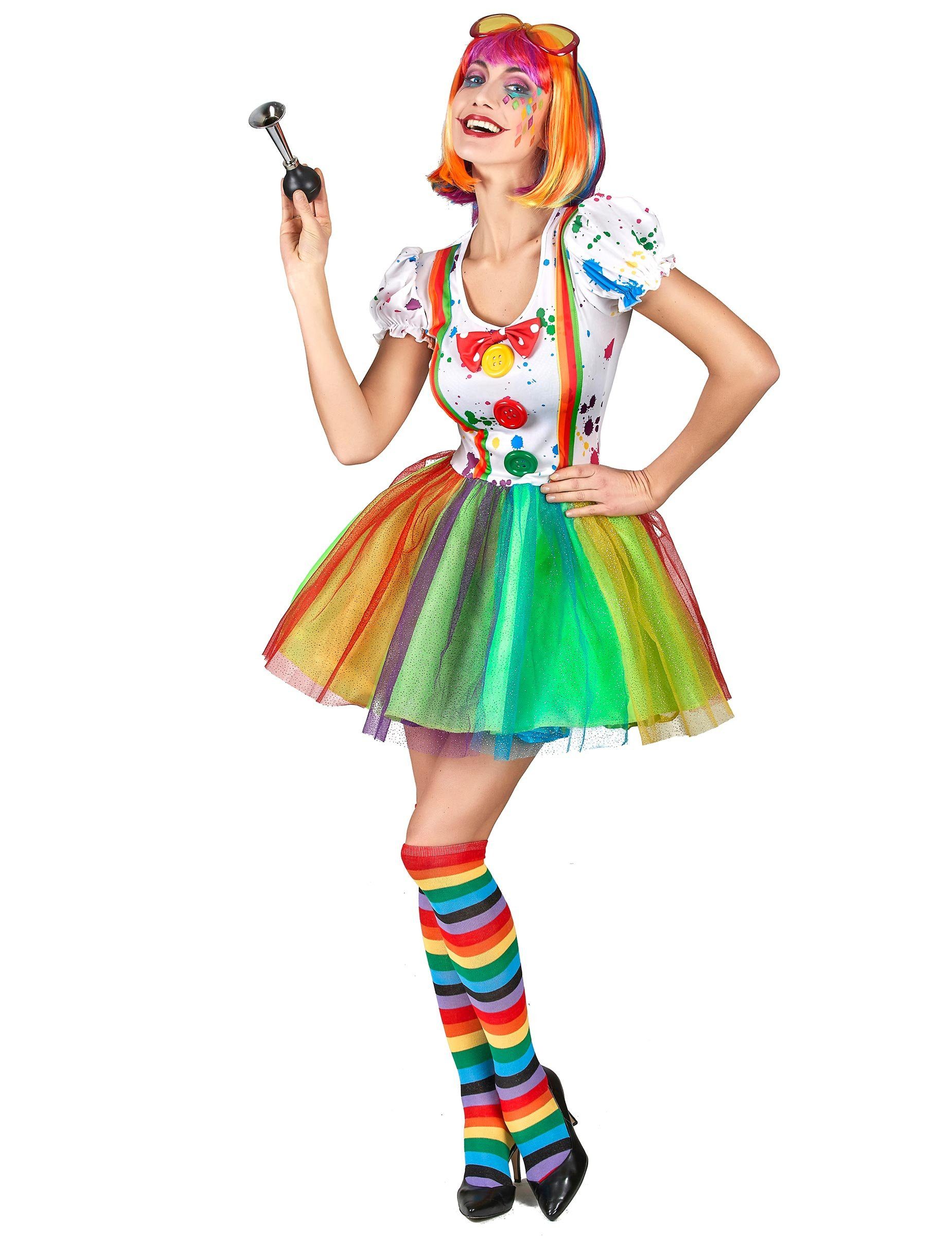 Das Kostüm Clown für Damen in Regenbogenfarben bietet ein Kleid mit eng anliegendem Oberteil und einem weit ausgestellten kurzen Minirockteil. Die Perücke, die Brille, die Hupe, die Strümpfe und die Schuhe gehören nicht zum Umfang der Lieferung. Das Kleid ist im Oberteil in der Farbe Weiß und im Rockteil mit Regenbogenfarben gestaltet. Es hat kurze Ärmel mit Puffärmeln und trägt einen Aufdruck von bunten Farbklecksen und -spritzern. Auf der Vorderseite sind auf dem Oberteil bunte Hosenträger aufgenäht. Am Ausschnitt sitzt eine rote Fliege, während über die Fläche verteilt bunte Knöpfe angebracht sind. Der Rockteil ist in mehreren Lagen genäht. Der untere Rock ist aus einem bunten satinartigem Stoff genäht, während der Überrock in einem regenbogenfarbigen Tüllstoff gefertigt ist, der mit Glitzern besät ist. Zeigen Sie auf der Themenfeier Zirkus Ihre clowneske Seite. Achtung! Nicht für Kinder unter drei Jahren geeignet. Kann Kleinteile enthalten - Erstickungsgefahr.