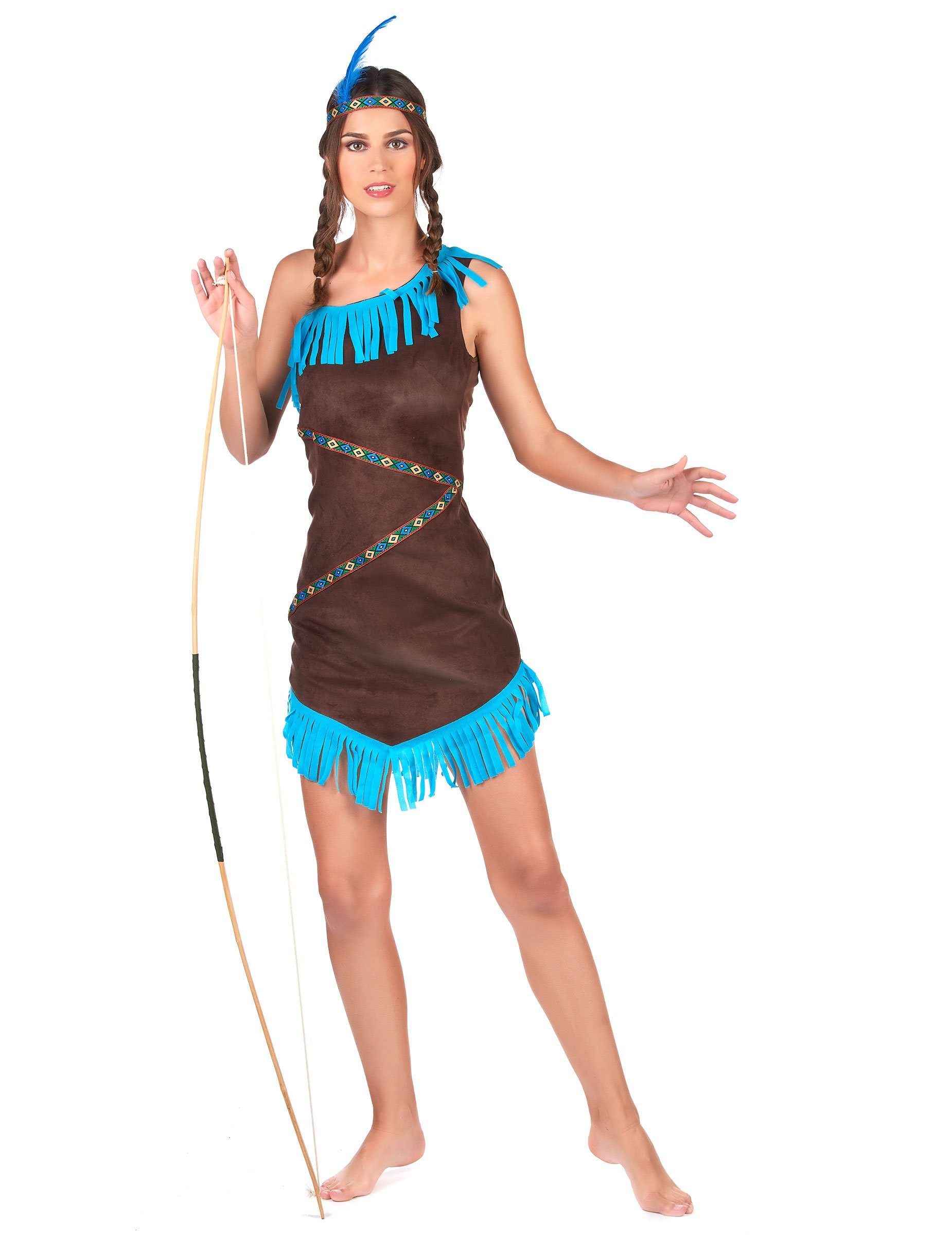 Das Damenkostüm setzt sich aus einem kleid und aus einem Haarband zusammen. Kette und Speer gehören nicht zum kostüm. Das Kleid ist an den Schultern asymmetrisch geschnitten und für den perfekten Tragekomfort mit einem transparenten Träger an der rechten Seite ausgestattet. Das Kleid ist am unteren Saum und am Ausschnitt mit einer breiten Borte mit Fransen in der Farbe Türkis gefertigt. Ebenso ist auf der Vorderseite des Kleides ein dünnes Bändchen aufgenäht, das ein Ethno-Muster zeigt. Das Kleid ist aus einem Stoff genäht, der Wildleder imitiert. Das Haarband aus elastischem Stoff wiederholt dasselbe Ethno-Muster des Kleides. Es trägt eine blaue Feder an der Seite, die dem Kostüm den letzten Schliff verleiht.Das Kostüm eignet sich perfekt für Mottopartys zum Thema Wilder Westen, aber auch zum Karnevalsfest! Achtung! Nicht für Kinder unter drei Jahren geeignet. Kann Kleinteile enthalten - Erstickungsgefahr.