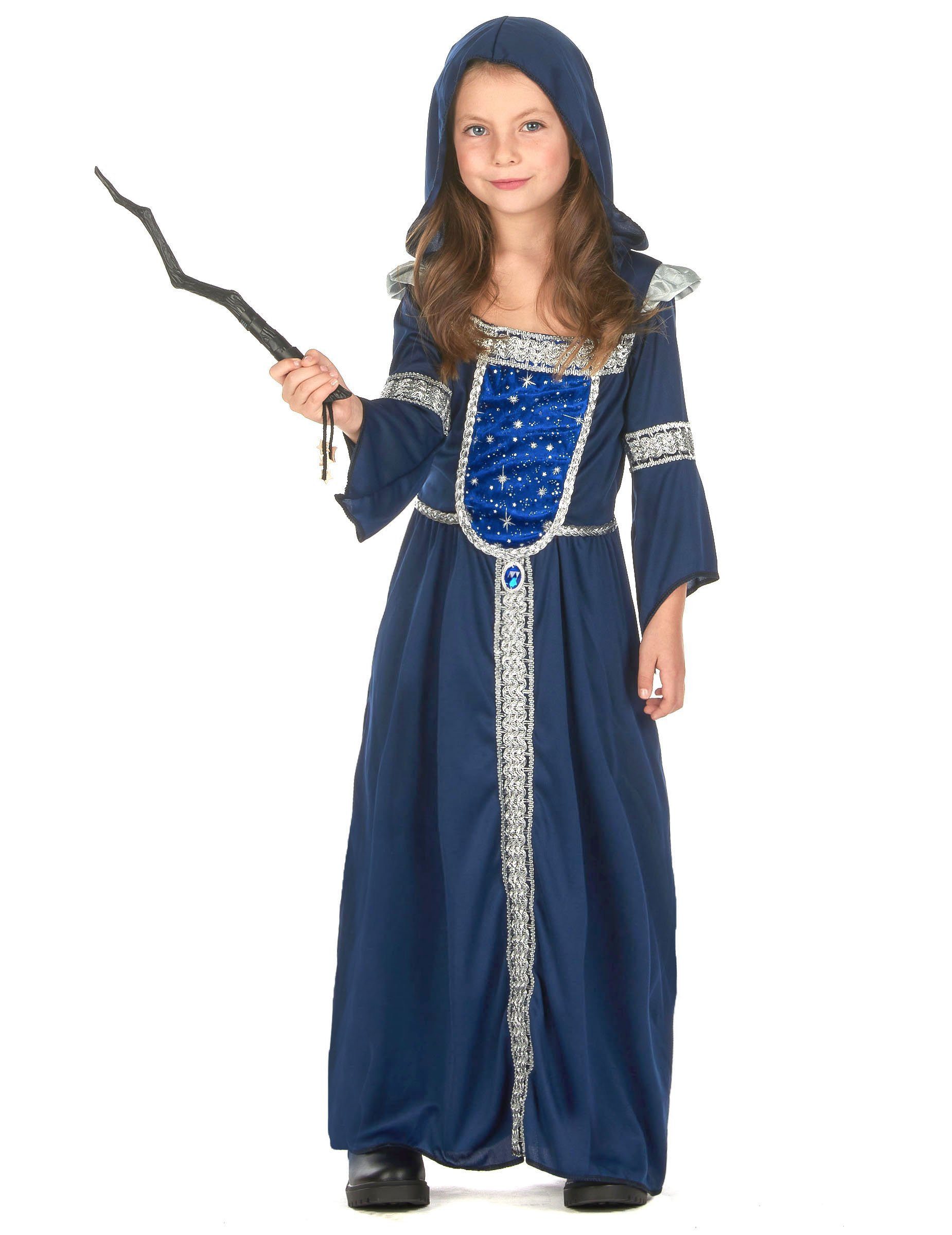 Dieses Zauberin-Kostüm ist für Mädchen und besteht aus einem Kleid. Das Kleid hat eine Kapuze und ist von blauer Farbe. Das Oberteil ist langärmelig und hat silberne Schulterklappen. Auf der Vorderseite ist es mit verschiedenen Sternen bedruckt. Der Kragen und die Ärmel sind mit silbernen Mustern versehen. Der untere Teil des Kleides ist nachtblau und auf der Vorderseite mit silbernen Mustern verziert. Ein wunderschöner falscher Schmuckstein schmückt die Taille. Dieses magische Zauberin-Kostüm wird ein Hingucker auf der nächsten Halloweenparty!