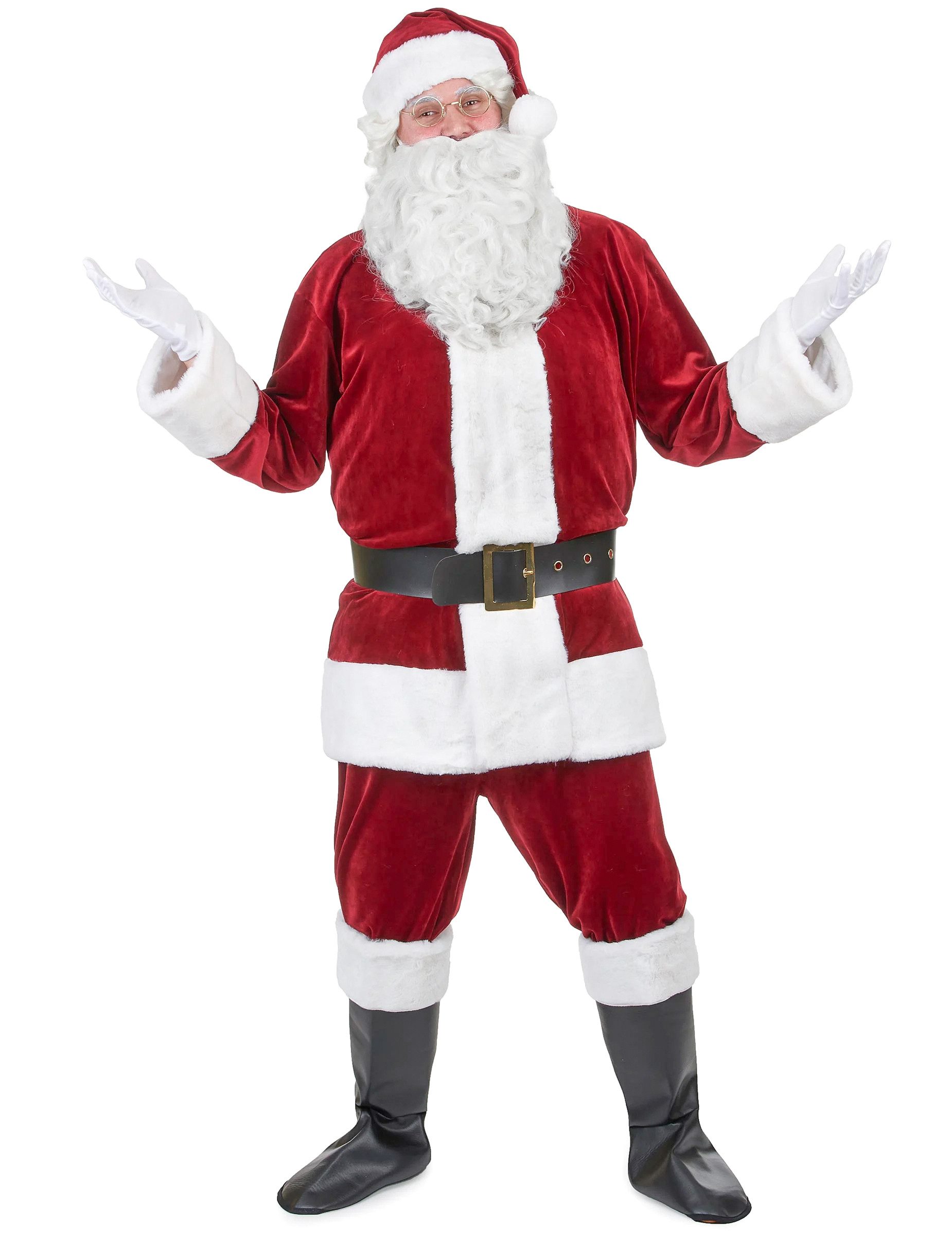 Unser sensationelles Weihnachtsmannkostüm für Herren beinhaltet eine Mütze, eine Jacke, eine Hose, Stiefelüberzieher, einen Gürtel und einen Bart. Handschuhe, Brille und Perücke gehören nicht zum Lieferumfang. Das Nikolauskostüm ist aus weichem Samtstoff gefertigt und äußerst angenehm zu tragen. Die Weihnachtsmütze hat einen Kopfumfang von etwa 62 cm, sodass Sie darunter noch eine Perücke tragen können. Der weiße Rauschebart wird mithilfe eines Gummibandes am Kopf befestigt. Die Hose reicht bis zu den Knien und wird mit den bis über die Knie reichenden Stiefelstulpen perfekt überdeckt. Der Gürtel kommt in Lederoptik und rundet das Santa Claus Kostüm perfekt ab. Ein wirklich grandioses Weihnachtskostüm für Herren, mit dem Sie auf der Weihnachtsparty oder daheim zur Bescherung sicher für einen imposanten Auftritt sorgen werden.