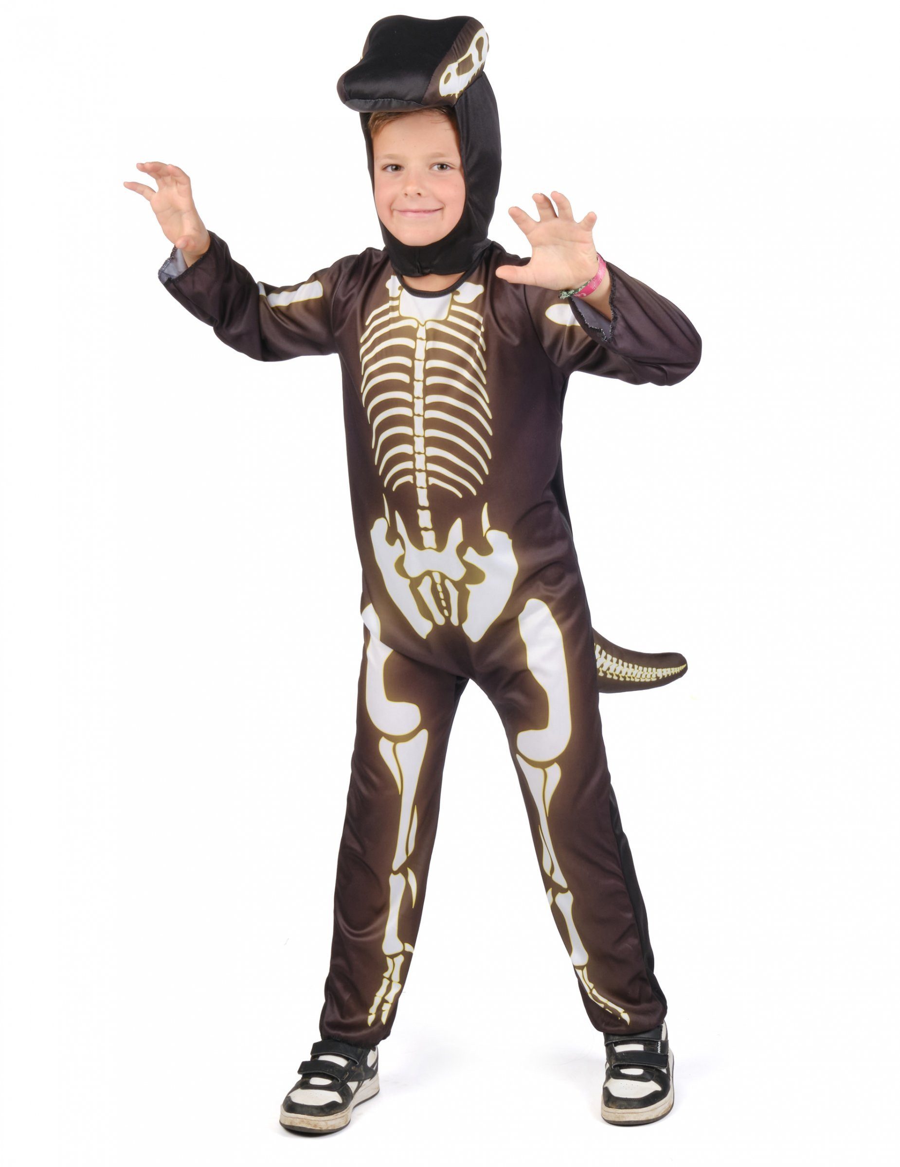 Dieses Dinosaurier-Kinderkostüm besteht aus einem Overall sowie einer Kapuze. Die Schuhe sind nicht enthalten. Der Skelett-Overall für Kinder ist schwarz und hat lange Ärmel und Beine. Auf der Rückseite ist ein Schwanz angebracht und die Kapuze des Overalls stellt den Kopf dar. Entlang des Overalls ist ein weißes Dinosaurier-Skelett aufgedruck, soass klar ist: hier handelt es sich um ein lebendiges Fossil! Mit diesem Dinosaurier-Kostüm für Kinder wird Ihr kleiner Dino-Fan zu Halloween oder Karneval viel Freude haben.