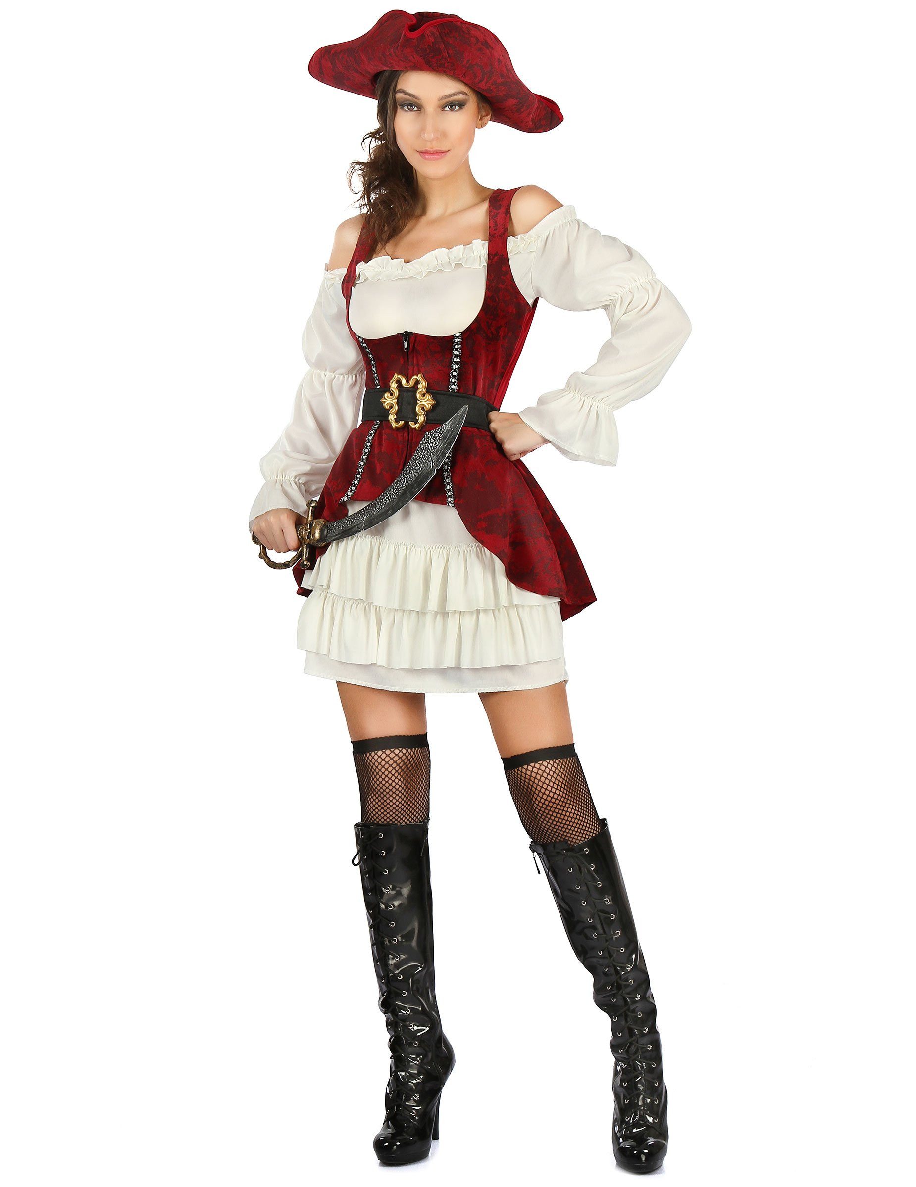Dieses umwerfende Piratinnen-Kostüm besteht aus einem Kleid, einer Weste, einem Hut und einem Gürtel. Der Säbel, die Stiefel und die Strümpfe gehören nicht zum Lieferumfang. Mit diesem Piratenkostüm für Damen sind Sie der Blickfang der 7 Weltmeere und zeigen dabei eindrucksvoll wer den Säbel in der Hand hält. Der Rock des weißen Piratenkleids ist auffallend gesteppt und die weißen langen Puffärmel ergänzen das Kleid perfekt. Die rote Weste stellt einen super Kontrast zum weißen Kleid dar und vervollständigt dieses SeeräuberinKostüm perfekt. Ein schwarzer Gürtel bringt das Piratinnenkostüm in die richtige Form und ein rotfarbener Hut macht aus Ihnen eine echte Piratin. Ein sensationelles Piratinkostüm, das für die nächste Karnevalsparty bestens geeignet ist.