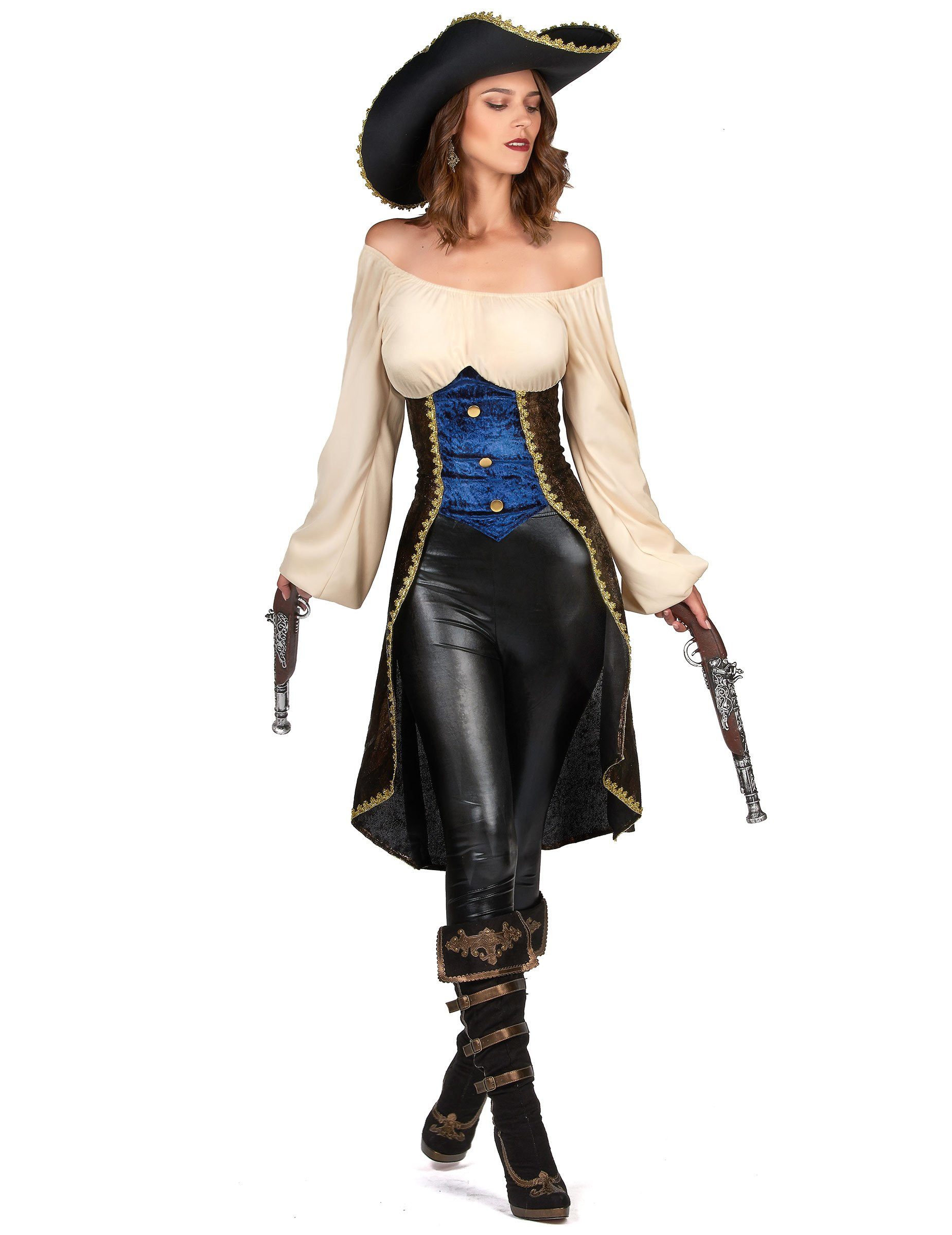 Das edle Piraten-Damenkostüm besteht aus einem Oberteil mit Schleppe und einem Hut. Die Leggings, die Schuhe und die Pistolen sind nicht im Lieferumfang enthalten. Das Oberteil der Piratin ist ein echter Eyecatcher: Die beige Bluse mit Carmen-Ausschnitt ist mit langen, weiten Ärmeln gestaltet. Unter der Brust setzt das blaue Mieder an, welches mit drei Zierknöpfen gestaltet ist. Am Mieder ist eine Schleppe in Dunkelbraun angenäht, die bis zu den Kniekehlen reicht. Der schwarze Hut mit goldenem Rand vervollständigt das Kostüm der Piraten-Lady, die zum Fasching oder einer Mottoparty gern gesehen ist!