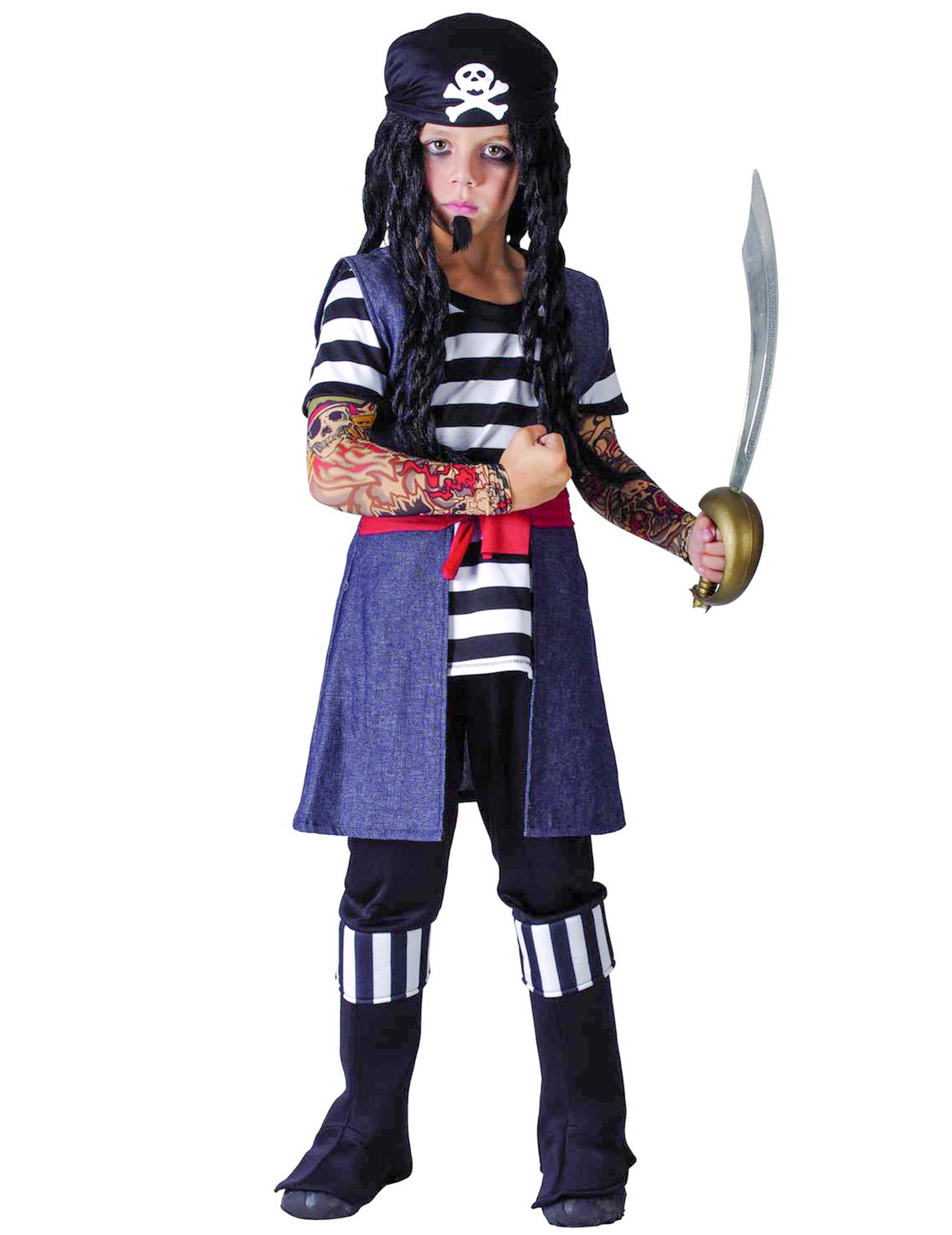 Das Pirat Kinderkostüm stellt das perfekte Seeräuber-Outfit dar, das im Nu Angst und Schrecken verbreitet. Die Kombination besteht aus einer Hose mit Stiefeln, einer langen Weste mit Gürtel und einem T-Shirt. Als besonderes Highlight gelten dieTattoo-ärmel und das Kopftuch mit Totenkopf (Schwert, Perücke, Bart und Schuhe sind nicht im Lieferumfang inbegriffen).Ein roter Gürtel verschließt die lange Weste in Jeans-Optik. Das T-Shirt darunter ist schwarz-weiß gestreift. Die Hose ist durch den elastischen Taillenbund bequem zu tragen. Unten sind Stiefel-überzieher angenäht, die mit Klettverschlüssen über den Schuhen befestigt werden. Achtung! Nicht für Kinder unter drei Jahren geeignet. Kann Kleinteile enthalten - Erstickungsgefahr.