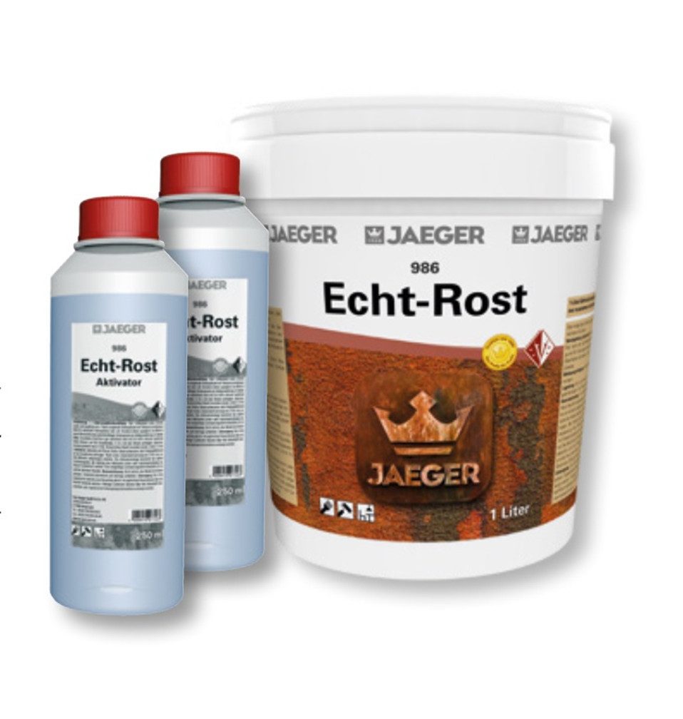 Verarbeitungshinweis | Grundfarbe Echt-Rost gut aufrühren und mit 30 Vol% Wasser verdünnen (300ml Wasser auf 1ltr Grundfarbe). 2 – 3 x mit der Walze auftragen, Zwischentrocknung jeweils минимум 4 Std. Danach über Nacht trocknen lassen. (минимум 12 Std.) Aktivator mit Pinsel, Rolle, Naturschwamm oder Pumpsprühflasche auf die Grundfarbe auftragen. Nach einer Zwischentrocknung von 2 Std. kann erneut Aktivator aufgetragen werden. Die Aktivatormenge bestimmt das spätere Erscheinungsbild, der Auftrag des Aktivators kann nach Zwischentrocknung beliebig oft wiederholt werden. Das endgültige Erscheinungsbild entwickelt sich im Lauf der nächsten Stunden. |