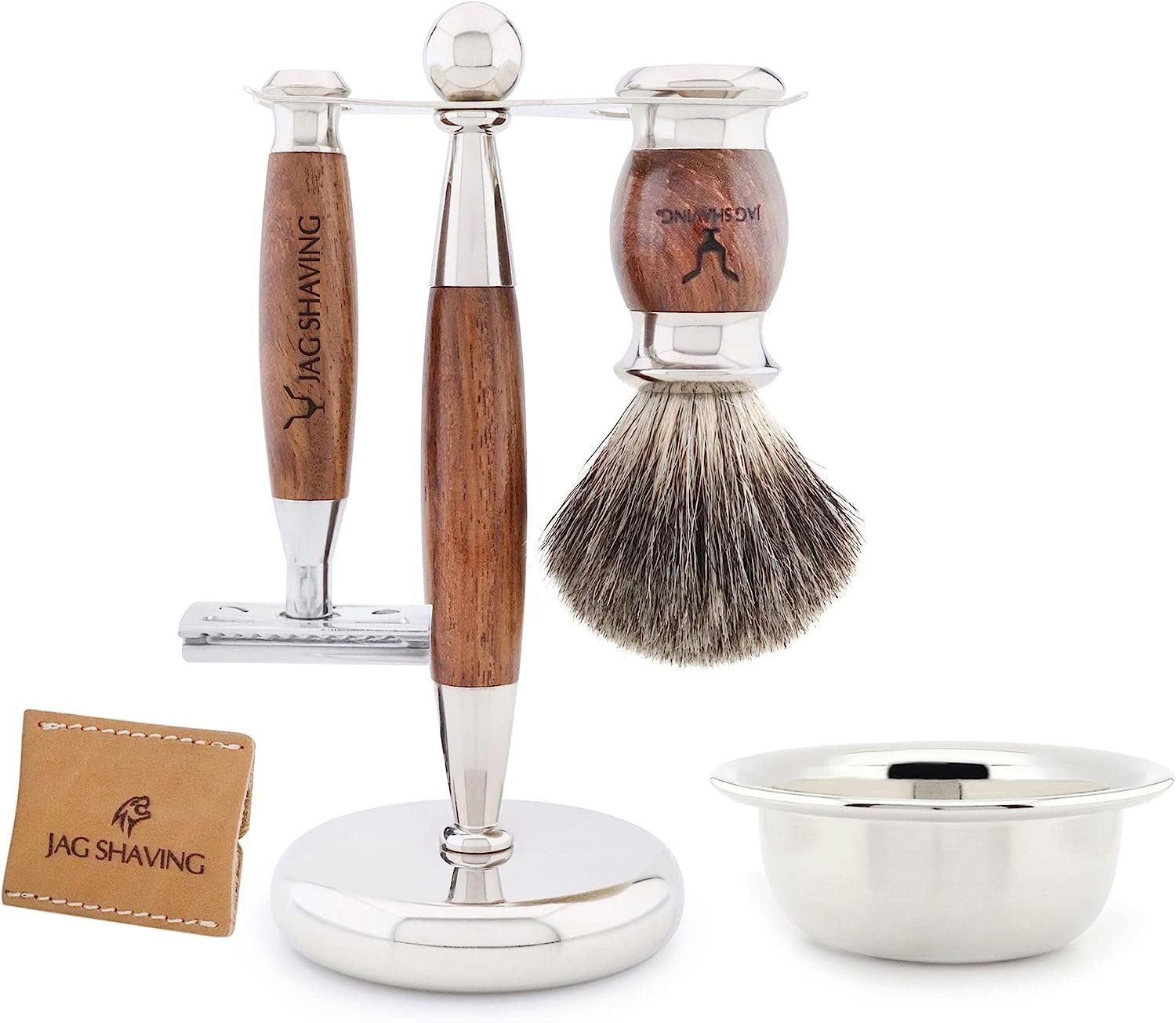 Jag Shaving vereint Qualität, Ästhetik und Komfort in diesem Premium-Rasierset. Unser hochwertiges Rasierset enthält erstklassige Rasierwerkzeuge, die ein müheloses und komfortables Rasiererlebnis ermöglichen und gleichzeitig die Haut mit Feuchtigkeit versorgen und frisch halten. Wir bieten eine Vielzahl von Rasiersets an, darunter Vintage-Rasiersets aus Holz, moderne Kollektionssets in Elfenbein oder Schwarz sowie Designer-Rasiersets in Gold, Kastanie und anderen Farben. Wir haben verschiedene Rasierset-Optionen mit unterschiedlichen Rasierprodukten wie Rasierpinsel, Rasierer, Rasierschale, Rasierseife, Rasierständer, Rasierständer und Alaunstift. Besuchen Sie unseren Shop, um die gewünschte Kombination von Rasierprodukten in einem Rasierset zu finden. Jag Shaving ist eine Premiummarke für Rasiersets, Rasierpinsel für Herren, Rasierer, Rasierapparate sowie verschiedene Körperpflege- und Haushaltsgeräte. Wir verfolgen den Ansatz von Premiumqualität und Inklusivität bei unseren Produkten, um sicherzustellen, dass sie von höchster Qualität sind und für alle Altersgruppen und Geschlechter geeignet sind. Wir bieten eine 100%ige Geld-zurück-Garantie, wenn Kunden mit unseren Produkten nicht zufrieden sind. Все unsere Produkte sind ästhetisch und sicher verpackt, um sie vor Transportschäden zu schützen. Sie sind ein perfektes Geschenk für jeden Anlass.