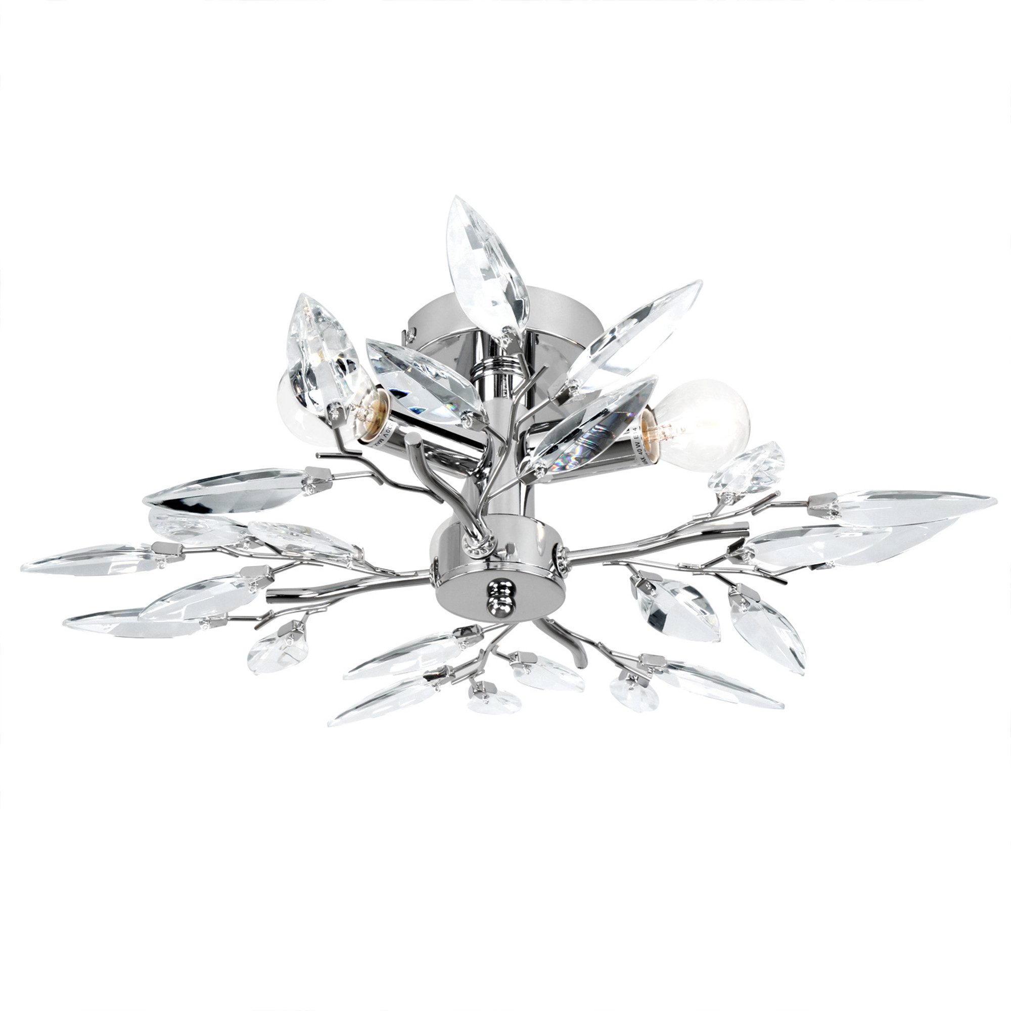 Die drei 40 Watt Glühbirnen sorgen für ausreichend Licht in Ihrem Flur, Schlafzimmer oder Esszimmer. Diese stilvoll gestaltete Deckenleuchte schafft nicht nur eine angenehme Lichtatmosphäre, sondern bringt auch besonderen Charme in Ihr gesamtes Zuhause. Der besondere Reiz dieser Leuchte liegt in der attraktiven Kombination aus verchromten Zweigen und Acrylblättern, die ein zauberhaftes Licht- und Schattenspiel erzeugen und damit sowohl zu klassischen als auch zu modernen Einrichtungsstilen perfekt passen.