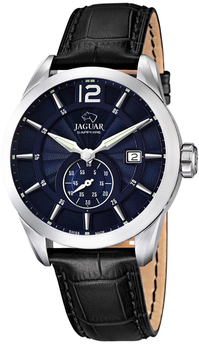 Die Elegant Uhr der Marke Jaguar hat ein schönes Armband aus Leder in schwarz mit Klappverschluss. Eine Uhr aus der Jaguar ACM Kollektion für Herren in der Gehäusefarbe silber mit Quarzwerk. Die Analoguhr mit Saphirglas hat ein Zifferblatt in der Farbe dunkelblau. Die Form der Uhr ist rund und das Gehäuse ist groß ca. 43mm.