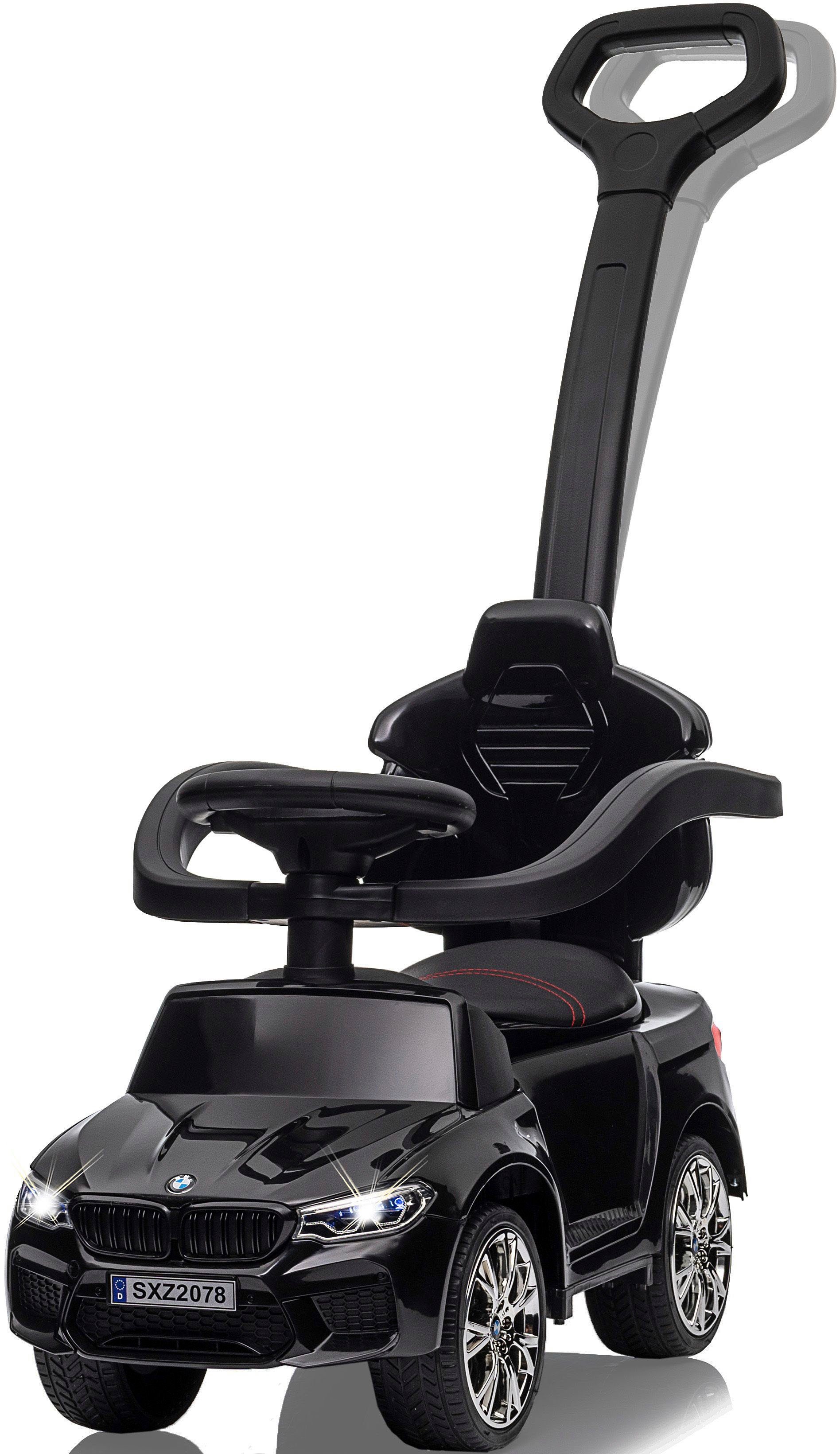 Flüsterreifen, Hupe am Lenkrad, Kippschutz, Kofferraum unter der Sitzfläche, Kunstledersitz mit Ziernähten, LED Licht vorne/hinten, Motorsound per Startknopf, Musik, Musik am Lenkrad, Offiziell lizenziert, Originalgetreue Optik, Schub- und Haltestange abnehmbar, Schub- und Haltestange mit Lenkfunktion, Schub- und Haltestange mit Rückenlehne und seitlichen Schutzbügel, Sitz aufklappbar