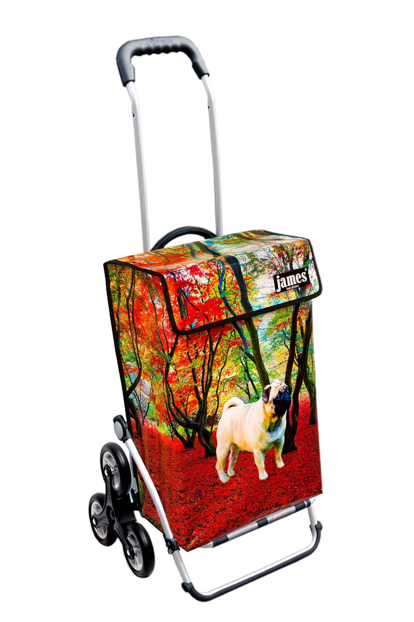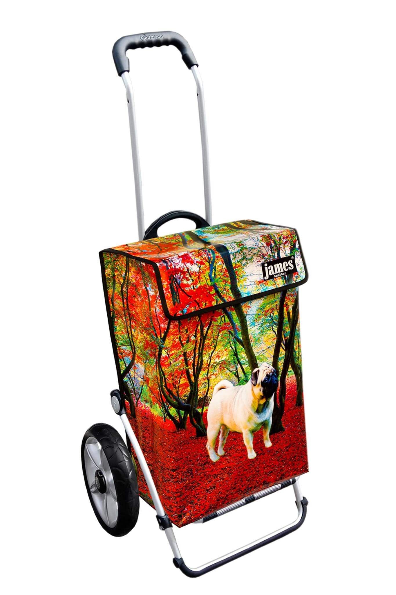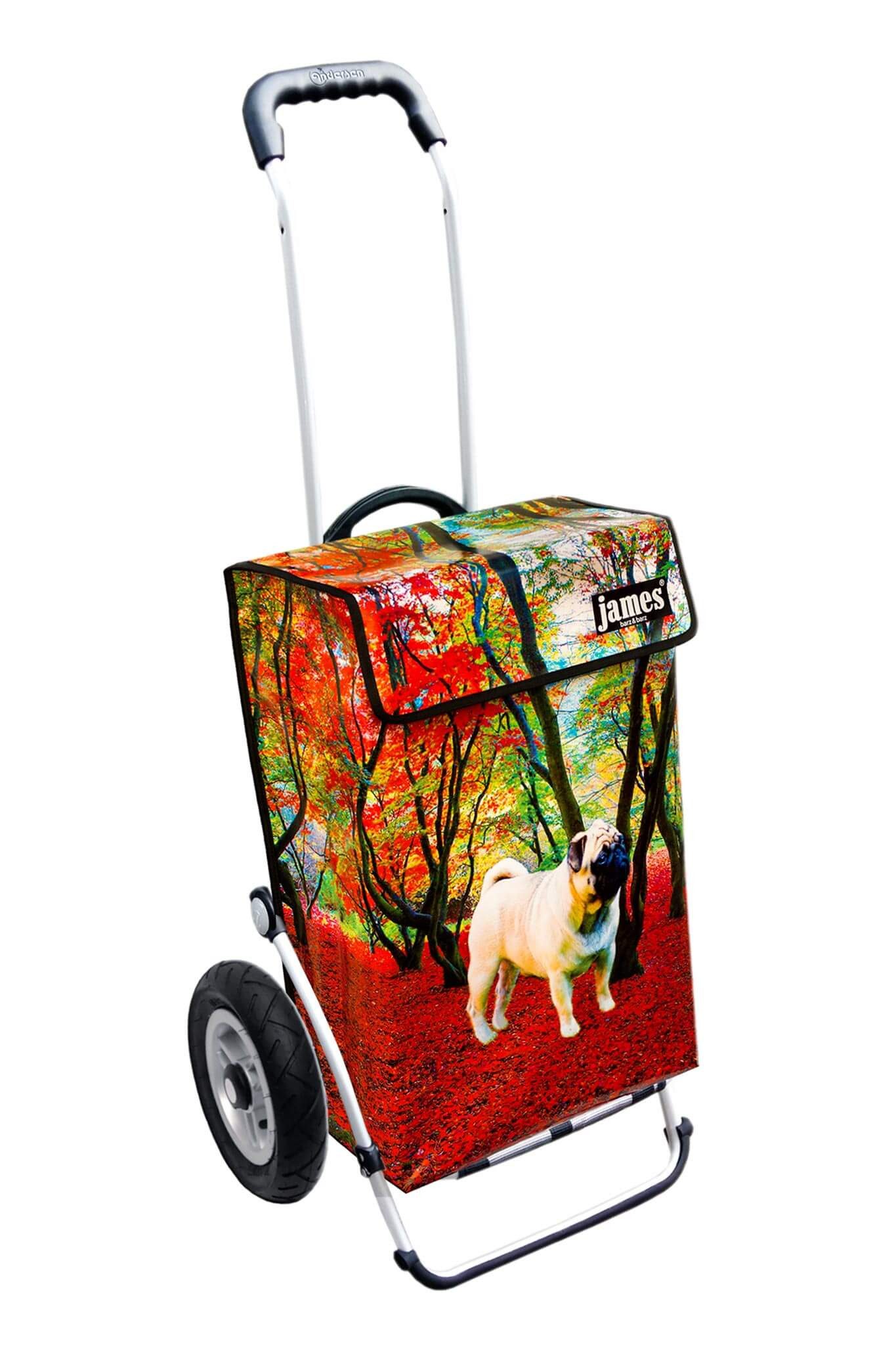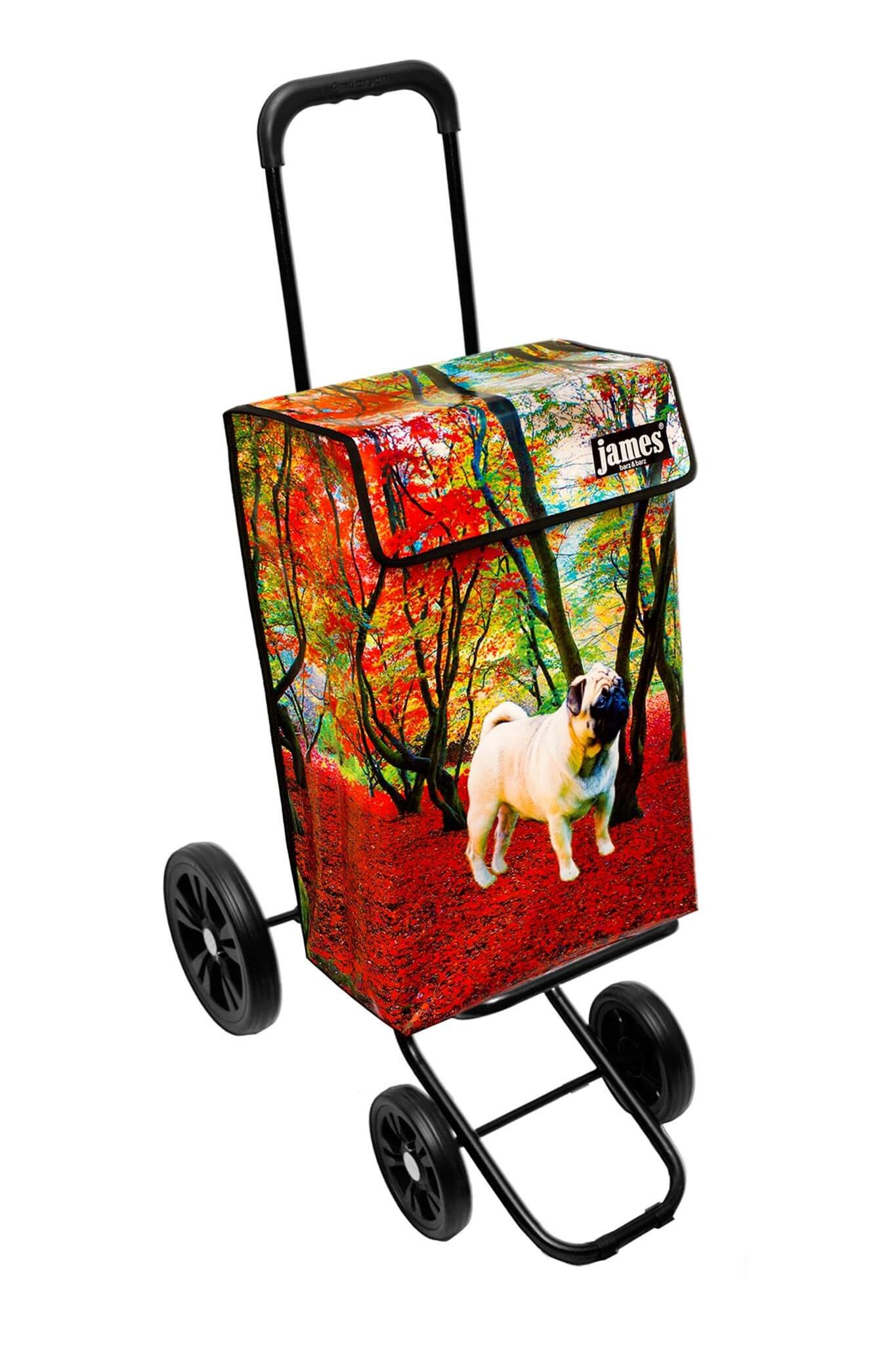 Der Mops im Herbstwald! ein Must-have für alle Mops-Liebhaber, denn wo sonst als bei James findet man einen Einkaufswagen mit einem Mops darauf?