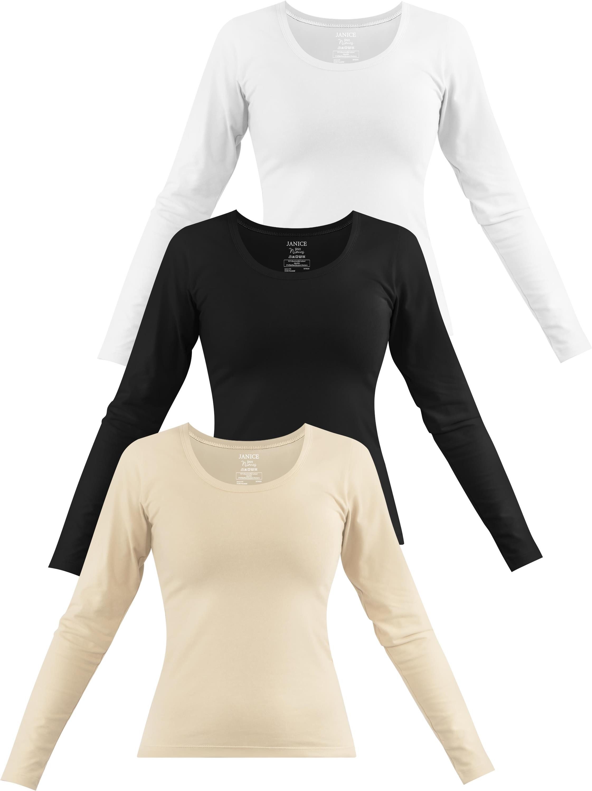 Basic Shirts für Damen, die zu jedem Outfit passen - ob leger, casual, business oder classic. Das klassische Langarm-Shirt kann sowohl unter einer Bluse, Hemd oder Lederjacke getragen werden. Ebenfalls sieht es alleine über einer Jeans, Shorts oder Rock besonders modern aus. Die Mischung aus hochwertiger Baumwolle und Elasthan sorgen für den optimalen Tragekomfort und einer tollen figurbetonten Passform. Der hohe Baumwollanteil garantiert einen angenehmen Tragekomfort, eine unkomplizierte Pflege und sorgt für ein optimales Tragegefühl zu jeder Jahreszeit und zu jedem Anlass. Das angenehme Material und die hochwertige Verarbeitung verleihen dem Oberteil einen modernen und eleganten Look. Die Shirts sind sehr pflegeleicht und können bei 40°C in der Waschmaschine gewaschen werden