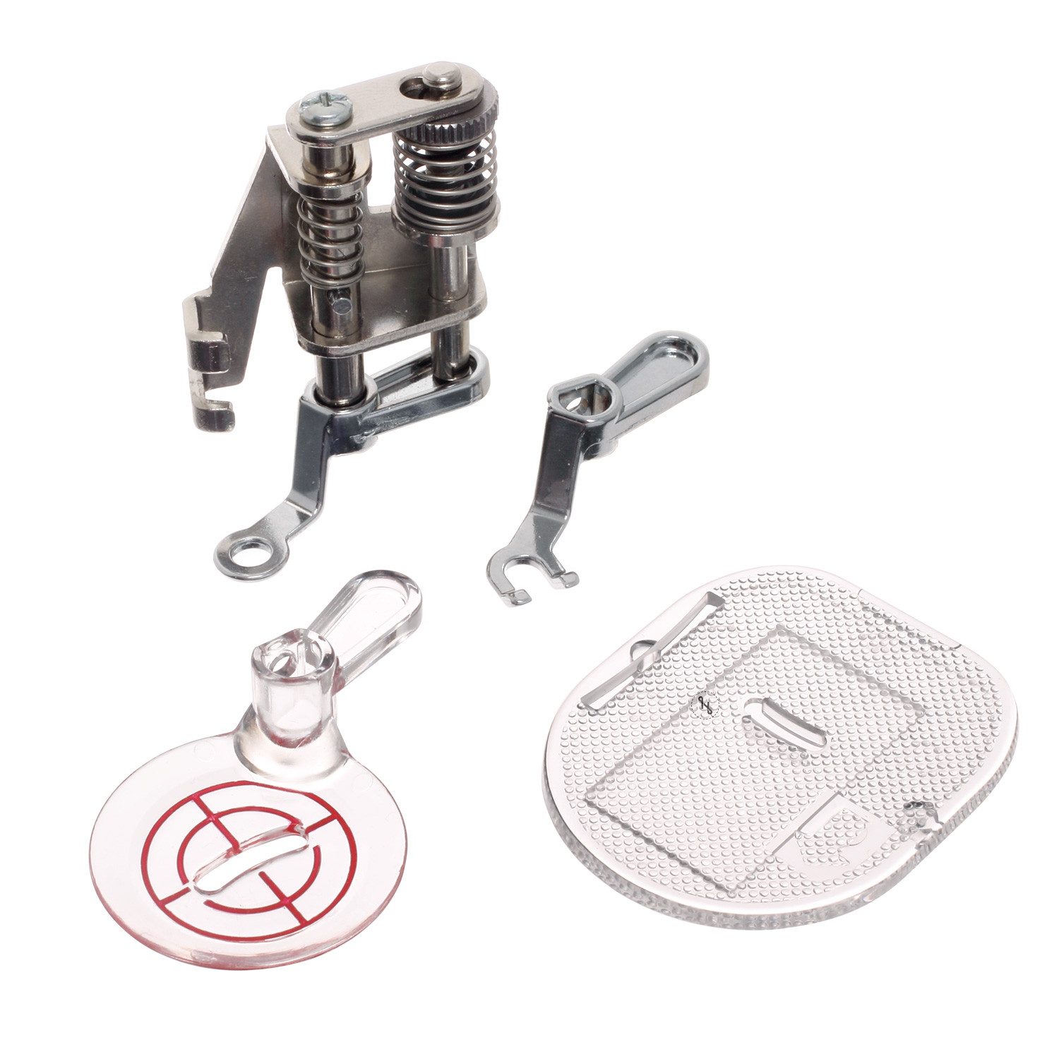 Sobald der am besten passende Fuß am Halter befestigt wurde kann die Höhe des Fußes für alle drei Sohlen und die Dicke der Stofflagen angepasst werden. Somit können die Füße leicht über die Oberfläche der Projekte gleiten.