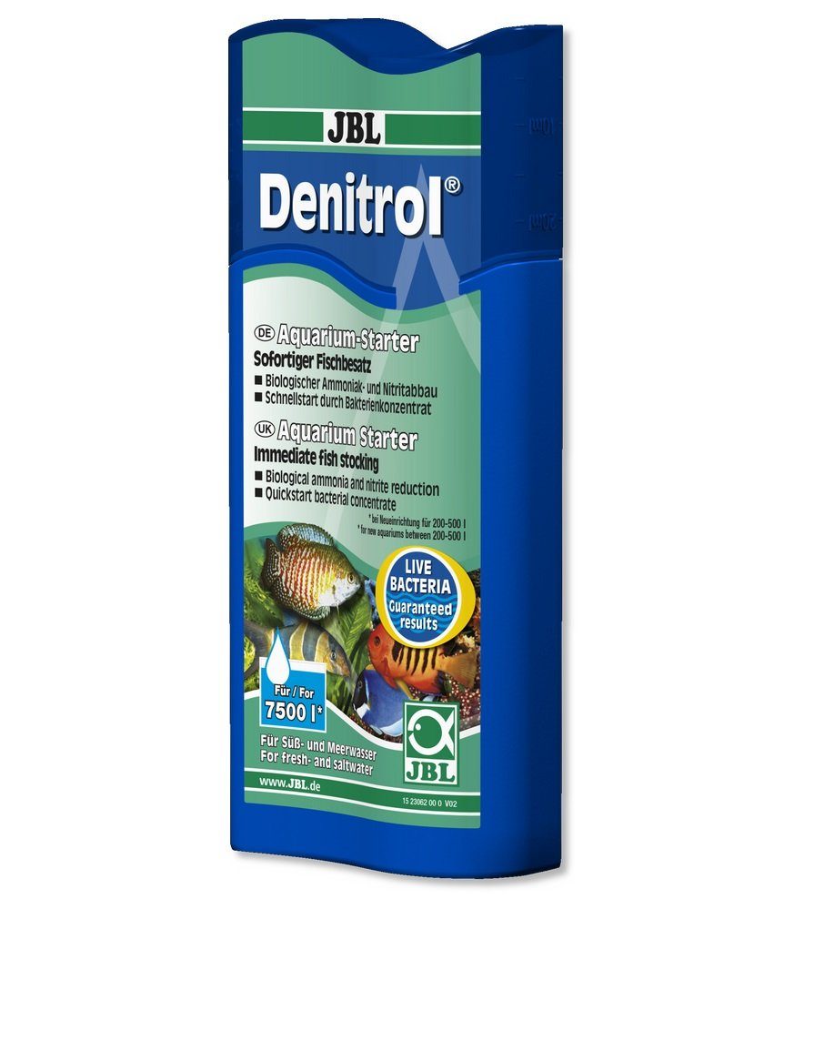 Es wird immer wieder diskutiert, ob man einen Tag nach der Neueinrichtung eines Aquariums bereits Fische einsetzen dürfe. Mikrobiologen stellten fest, dass sich die Bakterien in einem neuen Aquarium sehr langsam vermehren, wenn keine Wasserbelastung (Nahrung für die Bakterien) stattfindet. Wenn man aber Fische am nächsten Tag ohne Bakterienstarter einsetzt, kommt es zu Ammonium / Ammoniakproblemen, weil Bakterien sich anfangs zu langsam vermehren und mit dem Schadstoffanfall nicht schritthalten können. Beim Einsatz von JBL Denitrol (15 min nach JBL Biotopol-Zugabe) werden sofort hohe Bakterienmengen zugegeben. Wenn dann am nächsten Tag die ersten Fische eingesetzt werden, bekommen diese Bakterien auch Nahrung und beginnen sich zu vermehren. So wird sichergestellt, dass von Anfang an genügend Bakterien vorhanden sind und weder Ammonium/Ammoniak, noch Nitrit zum Problem werden.