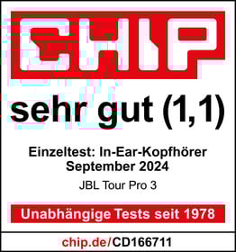 Die JBL Tour Pro 3 erzielen im Einzeltest des Magazins „Chip.de“ das Gesamtergebnis „Sehr gut (1,1)“. Der Top-Sound erhält die Bestnote „1,0“. Die sehr hohe Mobilität glänzt u. a. mit einer sehr langen Akkulaufzeit von „10:09 Stunden“ mit ANC und einer „guten“ Bluetooth-Reichweite. Die In-Ears sitzen sehr bequem. Außerdem bietet die „sehr gute“ Ausstattung u. a. eine hervorragende Geräuschunterdrückung und diverse Steuerfunktionen. Insgesamt sind die Pro 3 „starke In-Ears für jeden Musikgeschmack“.