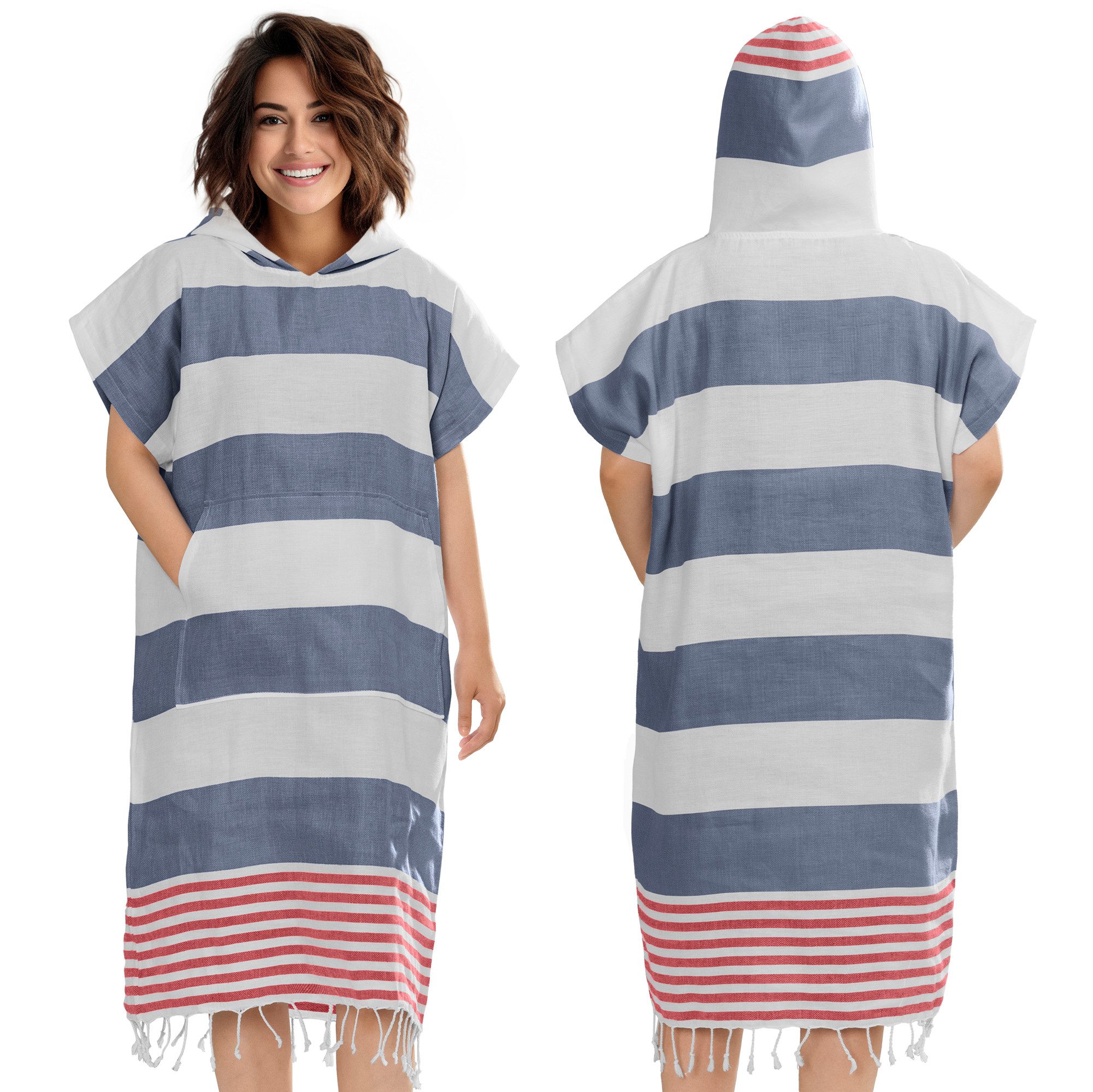 Vielseitig: Unser Badeponcho ist nicht nur ein praktisches Handtuch, sondern auch ein stilvolles Outfit. Trage ihn als Handtuch Kleid zum Strand oder nach dem Sport.