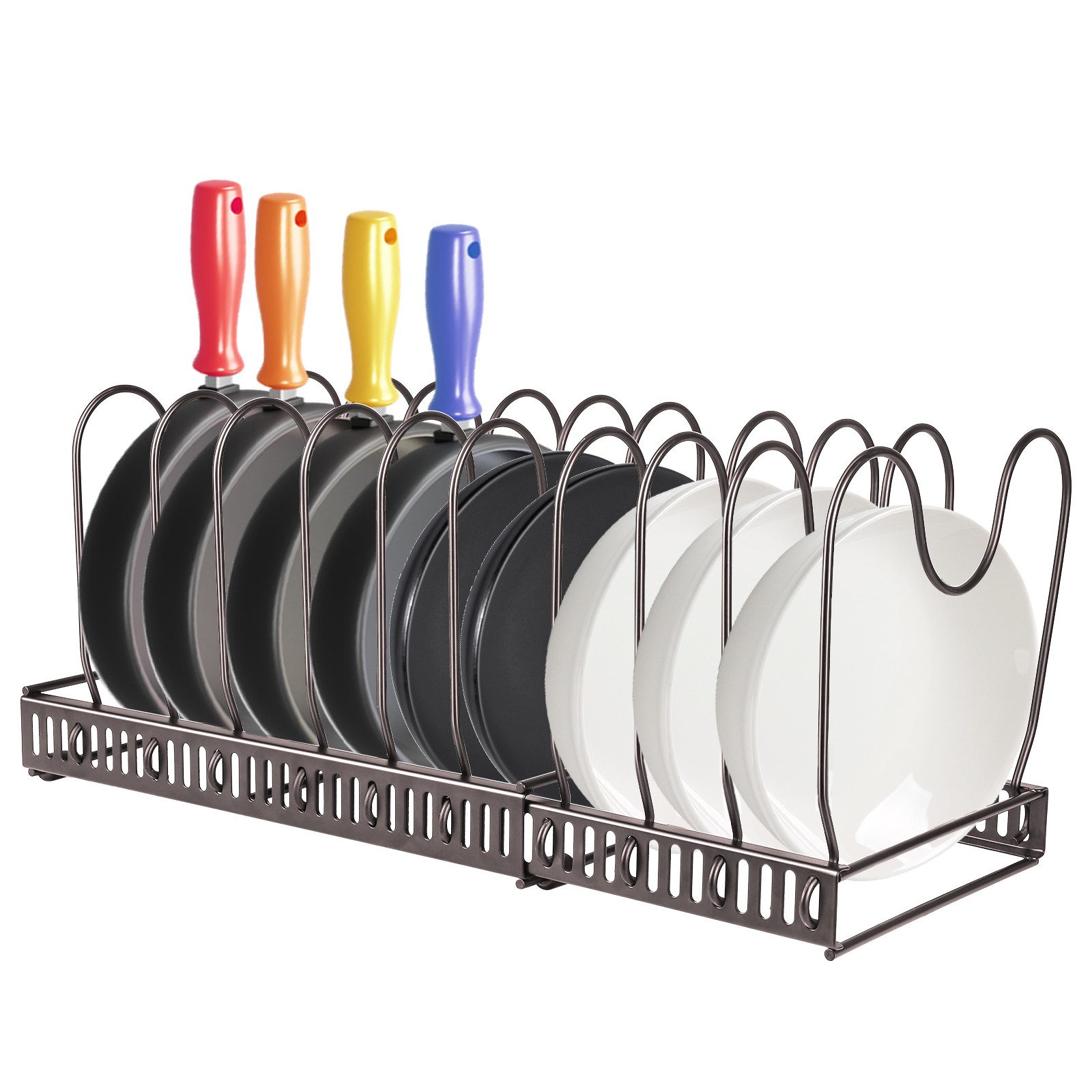 PlatzsparendDie Pfannenregale für Schränke eignen sich sehr gut zum Aufbewahren aller Arten von Pfannen, Bratpfannen, Backformen, Topfdeckeln und Geschirr usw. Sie helfen, die Küche oder Schränke sauber und ordentlich zu halten, und sparen viel Platz.