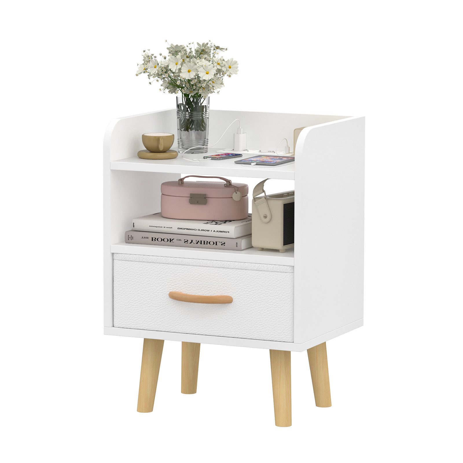Ausgestattet mit einer Tischplatte, einer Schublade und einem offenen Fach ist dieser kleine Nachttisch perfekt, um Ihre Gegenstände zu sortieren, zu organisieren und leicht zugänglich zu halten. Sie können Ihre Tischlampe, einen Bilderrahmen, einen Wecker oder Ihr Handy auf die Tischplatte stellen, die Bettlektüre ins offene Fach legen und kleine Gegenstände wie Schlüssel oder private Gegenstände in der Schublade verstauen