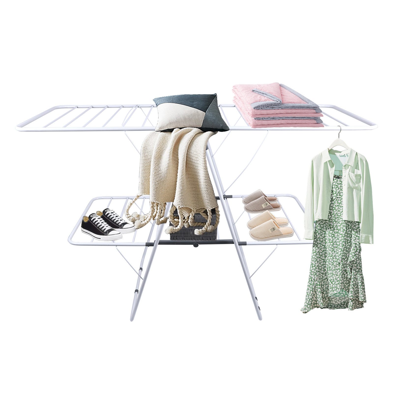 Der klappbare Wäschetrockner kann je nach Ihren Bedürfnissen und Bedingungen aufge-stellt werden. Man kann die Flügel ganz ausziehen oder die Kleidung nur an den Hauptstangen aufhängen.