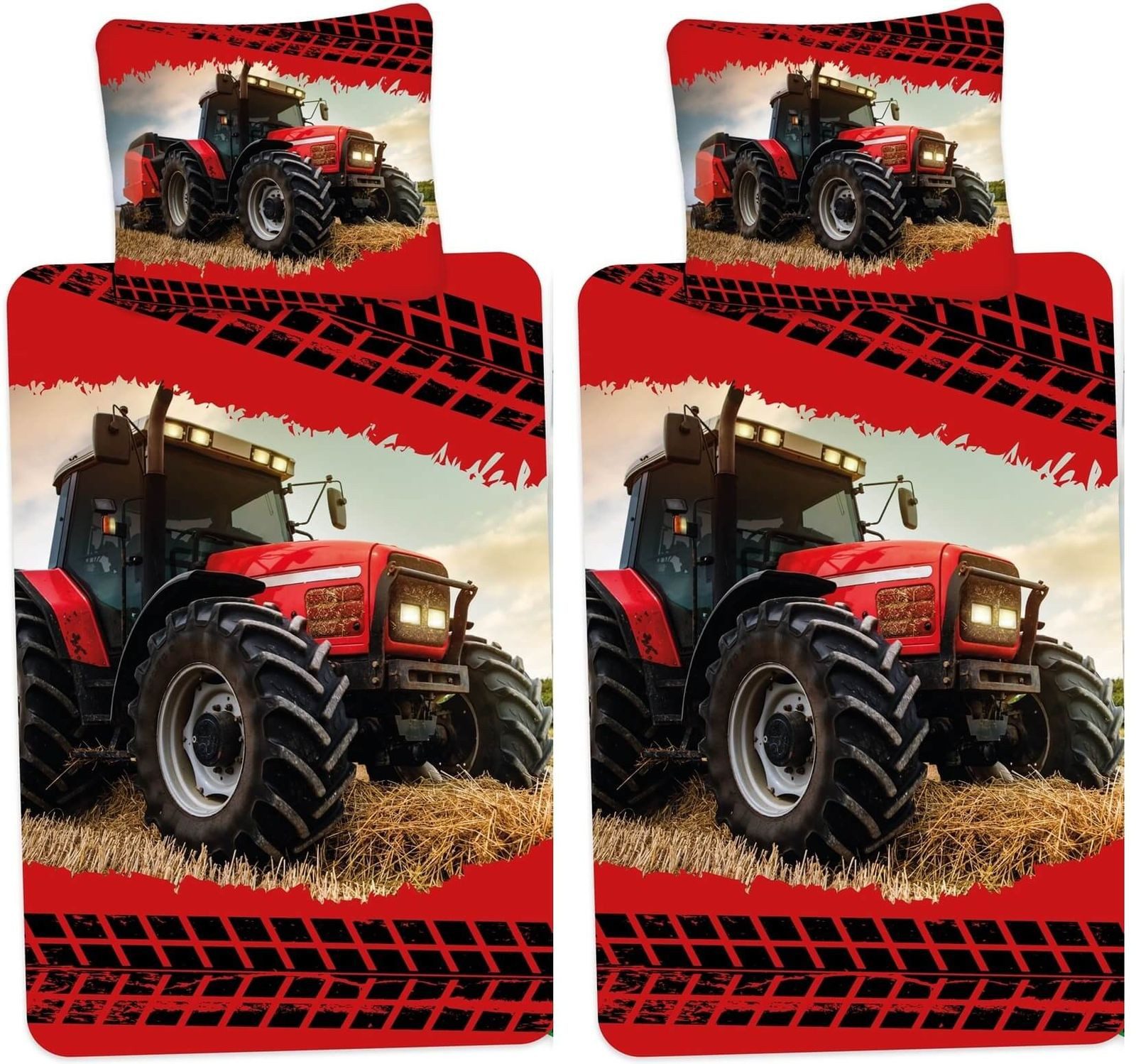 Sie erhalten zwei 2-teilige Bettwäsche-Sets bestehend aus je einem Bettbezug und einem Kissenbezug in glatter, weicher Baumwolle (Renforcé-Qualität) für Einzelbetten. Der Bettdeckenbezug und der Kopfkissenbezug sind mit einem Reißverschluss ausgestattet. Auf beiden Seiten der Wendebettwäschen befinden sich Traktor-Motive in hoher Druckqualität rund um die Welt der Landwirtschaft.