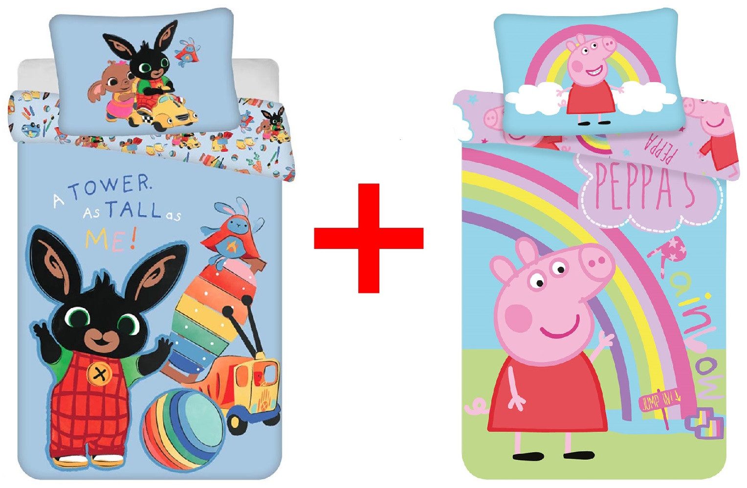 Der lustige Hase Bing Bunny und das Schweinchen Peppa Wutz sind nicht mehr aus der Filmwelt wegzudenken und begeistern bis heute kleine und große Zuschauer. Aufgrund ihrer weltweiten Bekanntheit zieren diese Stars mittlerweile unzählige Textilwaren, wie auch diese wundervollen Bettwäsche-Sets. Diese tolle Bettwäschen mit den Motiven aus der Animationswelt werden in jedem Schlafbereich zum Hingucker. So wird aus einem langweiligen Bett ein Rückzugsort. Die leichten Materialen der Bettdecken- und Kopfkissenbezüge sind angenehm kuschelig und weich, so dass Jung und Alt sich wunderbar einkuscheln können. Jedes Set besteht aus einem Kopfkissen-Bezug 40 x 60 cm und einem Decken-Bezug 100 x 135 cm. Perfekt geeignet für Standard Bettdecken.